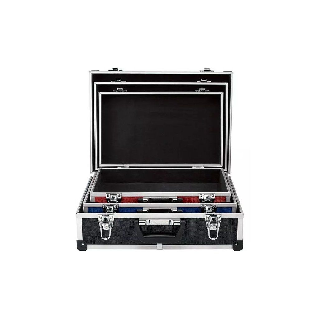 Praktická 3dílná sada kufrů. Ideální pomocník při skladování a transportu. Měkká výplň a vyztužené plastové rohy zvyšují ochranu. Ke každému kufru lze připevnit ramenní popruh (součástí dodávky). Elegantní kufříky tvořené hliníkovým rámem a plastovými prvky jsou pevnou a praktickou pomůckou pro uskladnění a přepravu nářadí či jiných pomůcek. S uzamykatelným zámkem.