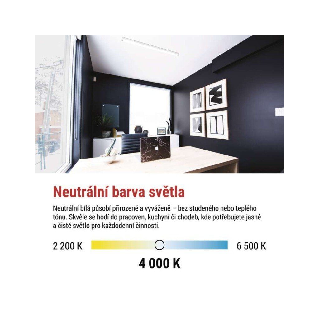 - Neutrální bílá barva světla: Teplota chromatičnosti 4 000 K poskytuje přirozené světlo, které neunavuje oči a věrně podává barvy.