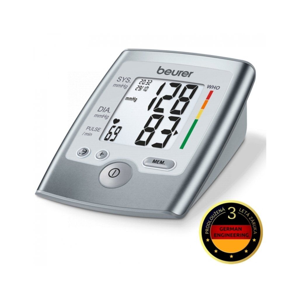 Tlakoměr a pulsoměr na paži Beurer BM 35 je plně automatický, má velký, dobře čitelný displej, 2x 60 pamětí, naměřené hodnoty krevního tlaku lze uložit a vypočítat si průměr denních a večerních hodnot za 7 dní, ukazuje čas a datum, krevní tlak vyhodnocuje dle mezinárodní klasifikace WHO, detekce arytmie, automatické vypínání, pro obvod paže 23 až 33 cm, kontrolka baterie, pouzdro.