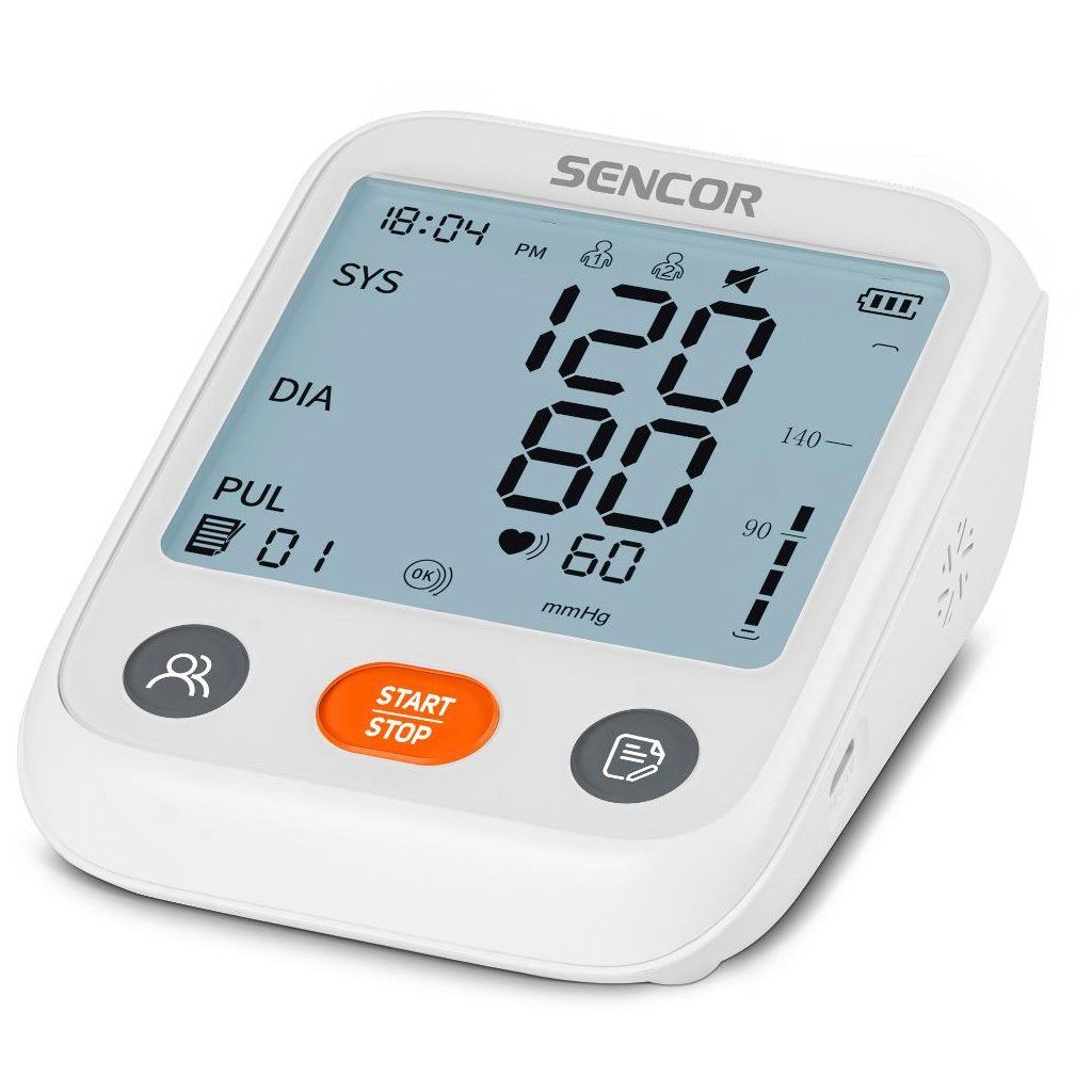 Tlakoměr Sencor SBP 1150WH Měří krevní tlak a srdeční tep metodou oscilometrie Pro snadné měření doma Detekce nepravidelného srdečního tepu Paměť pro 2 uživatele a 199 měření s datem a časem LCD obrazovka: 70x82 mm Nastavitelný manžetový pás délky 22-42 cm Napájení: 4 x AAA baterie nebo kabel typu C (USB-C) Barevné zvýraznění hodnotDoplňkové parametry