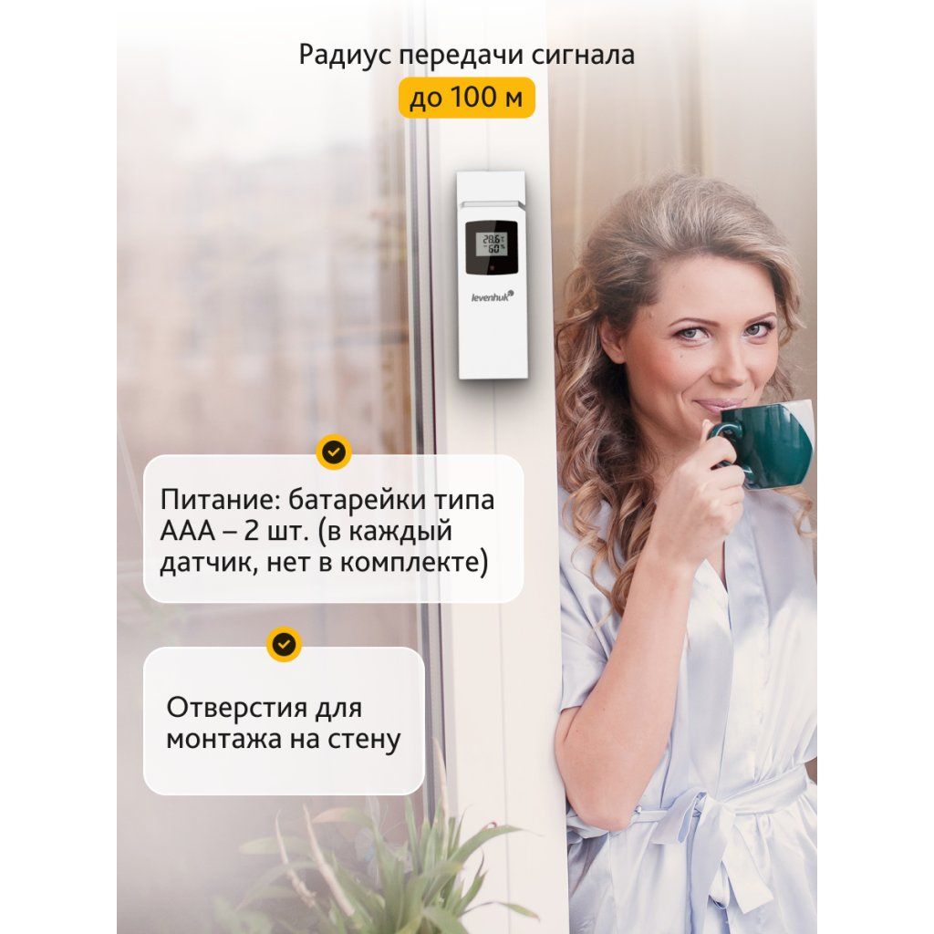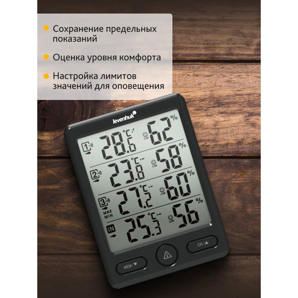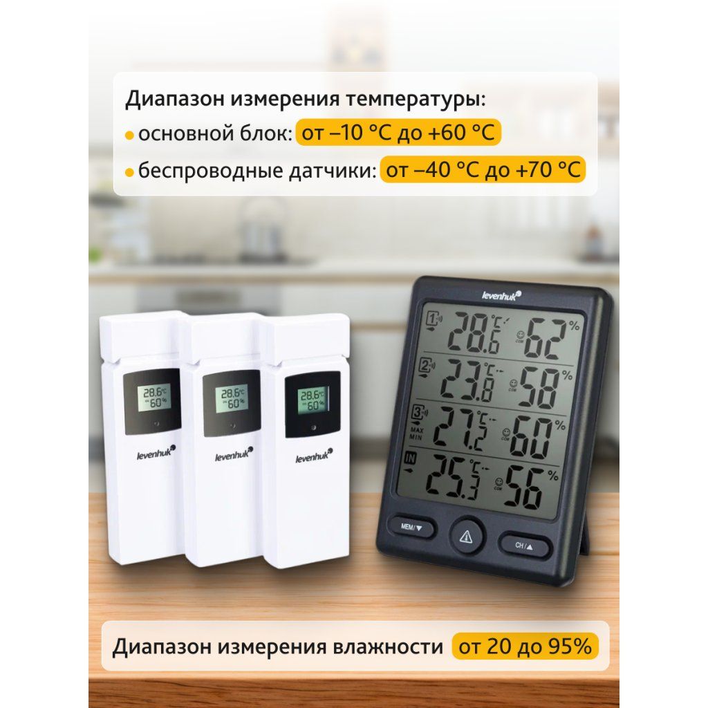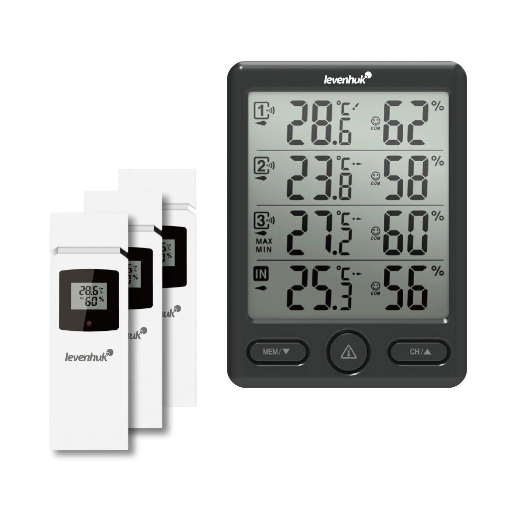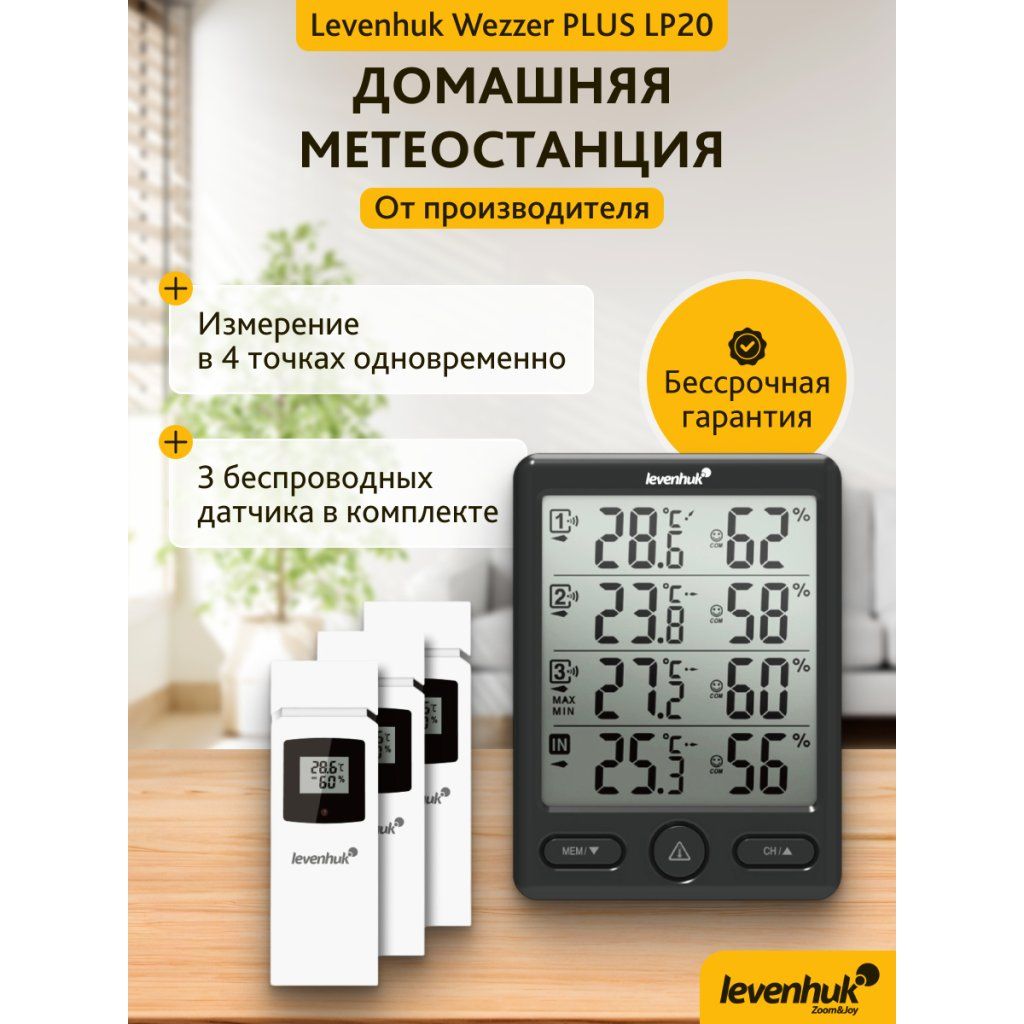Meteorologická stanice Levenhuk Wezzer PLUS LP20 měří teplotu a vlhkost současně na čtyřech místech. Je to velmi praktický přístroj pro sledování změn počasí a mikroklimatu v několika místnostech, například v budovách na pozemku. Základna meteorologické stanice měří teplotu a vlhkost v místě instalace a lze ji namontovat na stěnu nebo umístit na rovný povrch. Tři bezdrátové senzory dálkového ovládání přenášejí údaje do základnové stanice prostřednictvím rádiového spojení. Senzory mohou být namontovány na stěnách až do vzdálenosti 100 m od základnové stanice.