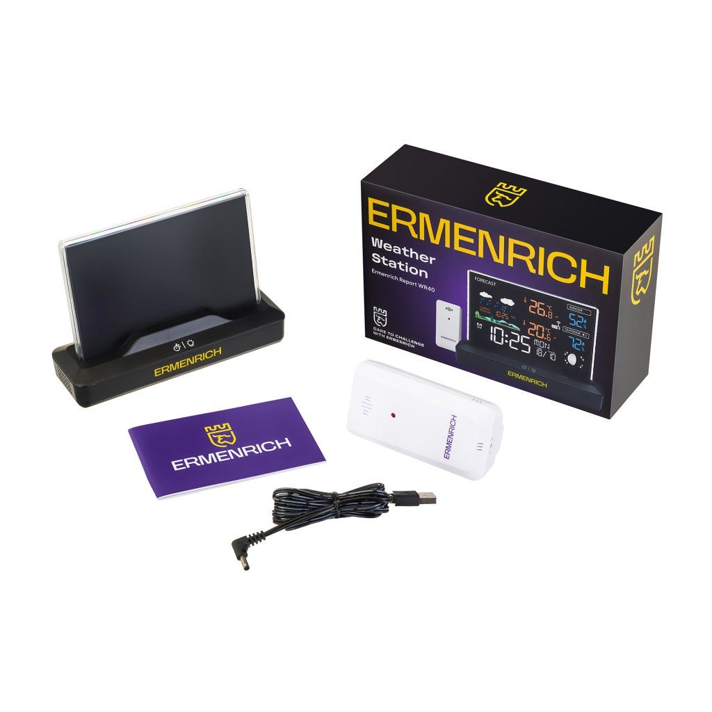 Ermenrich Report WR40 je stolní digitální meteorologická stanice určená pro domácí použití. Poskytuje přehledné zobrazení vnitřní i vnější teploty a vlhkosti, atmosférického tlaku, hodin s kalendářem a budíkem. Díky bezdrátovému dálkovému senzoru a výraznému barevnému displeji je vhodná pro uživatele, kteří chtějí rychle a spolehlivě sledovat základní atmosférické parametry.