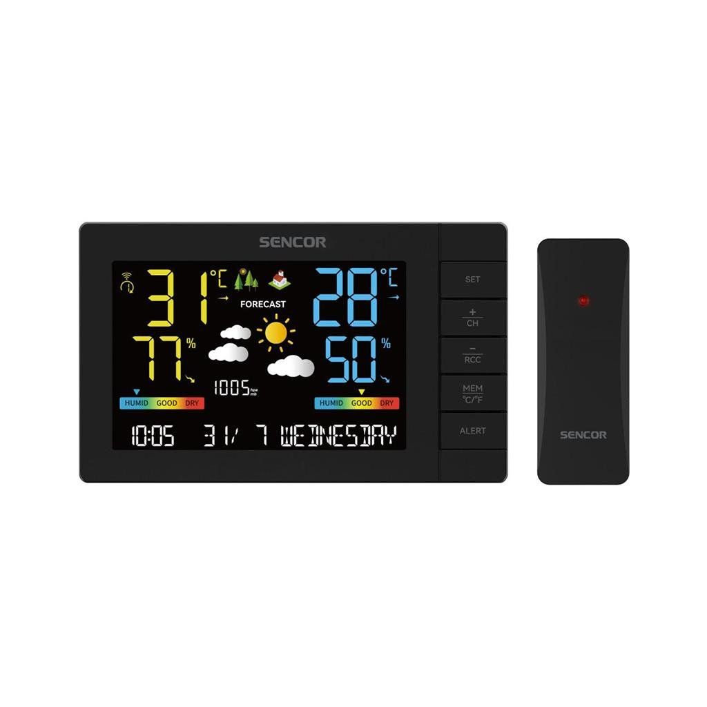 Meteostanice Sencor SWS 4440 Chytře na každodenní počasí Meteostanice SENCOR SWS 4440 umí sledovat venkovní i vnitřní teplotu ve stupních Celsia a Fahrenheita, vlhkost vzduchu v procentech i barometrický tlak. Vydává varování v případě námrazy, které ocení motoristé a osoby se zhoršenou schopností pohybu a také umí předpovědět počasí ve formě grafických ikon (déšť, jasno, polojasno a další). Maximální a minimální zaznamenané údaje za 24 hodin se automaticky ukládají do paměti a můžete je zpětně kontrolovat. Na displeji se zobrazuje aktuální čas řízený rádiovým signálem. Můžete si nastavit duální budík pro pravidelné buzení. Multifunkční meteostanice s čidlem Často vás překvapí počasí a běžné předpovědi jsou nepřesné? S meteostanicí SENCOR SWS 4440 neuděláte chybu. Meteostanici postavíte nebo zavěsíte na příhodné místo v domácnosti a zapojíte přiloženým adaptérem do elektrické sítě. Ven na zahradu nebo na balkon patří venkovní čidlo, které je napájeno bateriemi (2× AA) a funguje bezdrátově. Můžete jej umístit až na 80 metrů od meteostanice. Po několika minutách získávání informací čidlo vyšle aktuální data a ta se zobrazí na barevném displeji stanice, včetně předpovědi počasí na 12–24 hodin ve formě barevných ikon. Ikona předpovědi počasí (slunečno, mírně oblačno, oblačno, déšť, sněžení) Předpověď na 12 ~ 24 hodin založená na změně tlaku a teploty vzduchu Hodnota barometrického tlaku Měření vnitřní teploty a vlhkosti s indikátorem vývoje Měření venkovní teploty a vlhkosti s indikátorem vývoje Rádiem řízené hodiny pomocí signálu DCF77 (možnost ručního nastavení) Digitální čas, Datum a den v týdnu Indikace úrovně komfortu (3 úrovně) Varování před mrazem pro venkovní kanál Funkce upozornění na vysokou / nízkou venkovní teplotu Funkce upozornění na vysokou / nízkou vnitřní teplotu Max. / Min. záznamy v paměti (24h) Budík s funkcí opakovaného buzení Rozsah měření vnitřní teploty: -9 až +50°C Rozsah měření venkovní teploty: -40°C až +60°C Rozsah měření vlhkosti 1% až 99% RV 12 / 24 hodinový formát Zobrazení stupnice teploty °C / °F 3 úrovně jasu displeje Umístění na stůl nebo na stěnu Indikátor vybité baterie pro bezdrátový senzor Možnost připojení až tří senzorů Možnost automatického střídání zobrazení naměřených dat všech tří senzorů 1 senzor součástí balení (SWS TH2300-3200-4440) Přenos na vzdálenost - až do vzdálenosti 80 m (v otevřeném prostoru) Frekvence vysílání senzoru: 433,92 MHz Napájecí adaptér hlavní jednotky: DC 5 V / 1200 mA (součást příslušenství), Spotřeba: 6 W Záložní baterie hlavní jednotky: 3 x 1,5 V typ AA (baterie nejsou součástí balení) Napájení senzoru: 2 x 1,5 V typ AA (baterie nejsou součástí balení) Rozměry hlavní jednotky: (š/v/h) 138 x 84 x 27 mm Hmotnost hlavní jednotky: 166 gDoplňkové parametry