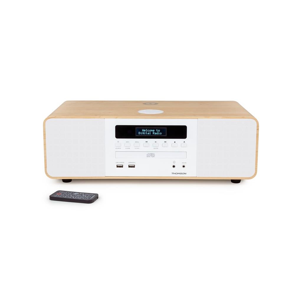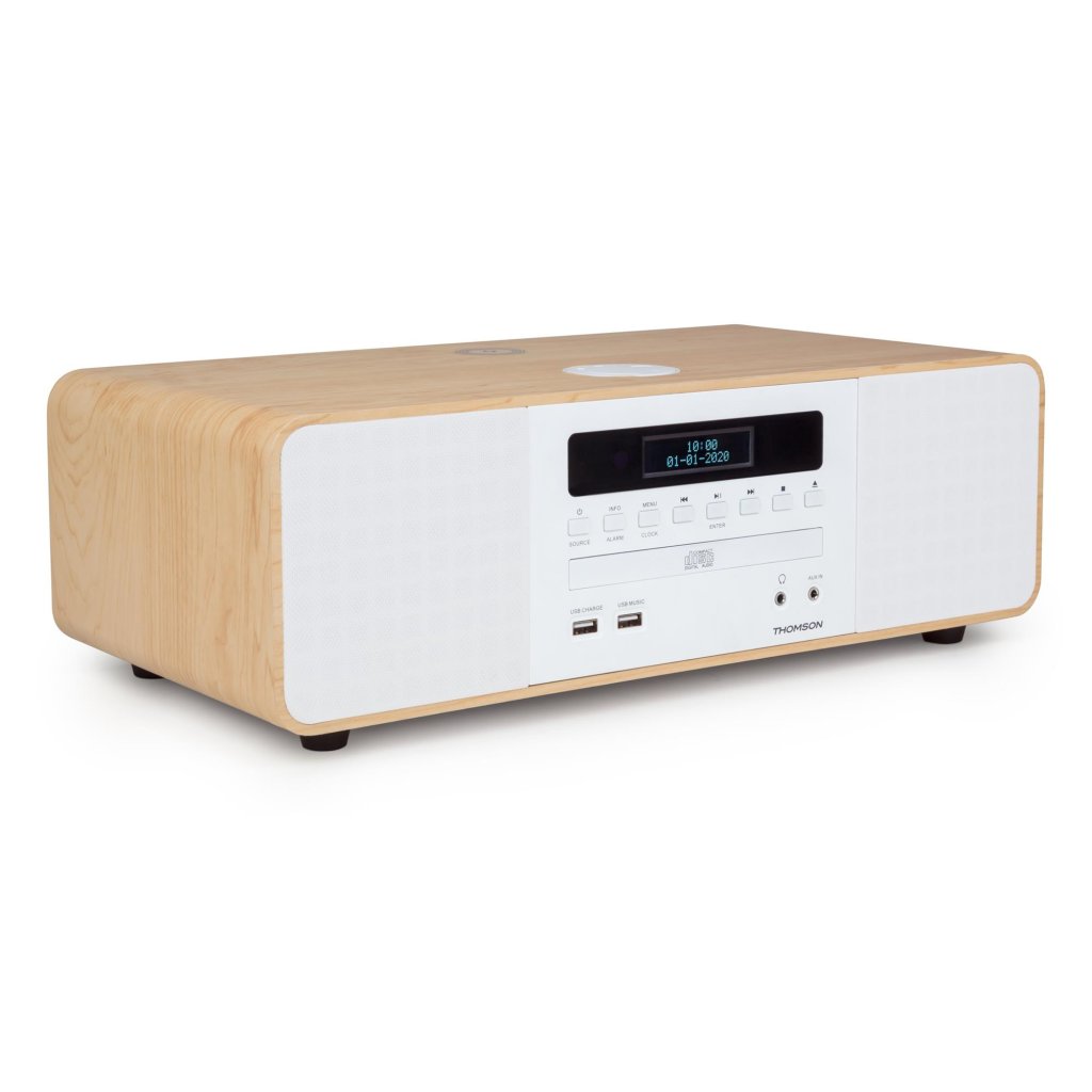 Mikrosystém Thomson MIC201IBT v elegantním dřevo/bílém provedení je všestranným audio řešením pro moderní domácnost. Tento stylový přístroj na první pohled zaujme svým vytříbeným designem, který harmonicky spojuje klasické dřevěné prvky s čistě bílými detaily. Na přední straně najdete přehledné tlačítkové ovládání a podsvícený displej, který vám vždy poskytne důležité informace o naladěné rádiové stanici nebo přehrávaných skladbách.
