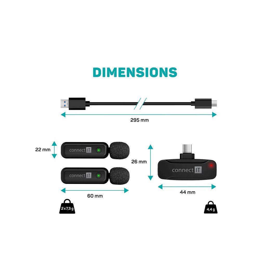 CONNECT IT Wireless Lavalier mikrofon USB-C konektor (2 ks + receiver) set ČERNÝ ClipMic BLACK --- 2 x bezdrátový lavalier mikrofon set s přijímačem a ochranným windscreen filtrem. --- Malý, výkonný bezdrátový mikrofon ClipMic je vhodný pro pořízení audio záznamu pro Vaše videa či podcasty ve vysoké kvalitě. Je skvělým doplňkem pro všechny digitální tvůrce při tvorbě rozhovorů, podcastů či instruktážních videí. Dlouhá výdrž baterie, vysoká citlivost mikrofonu a žádné zbytečné kabely, to jsou hlavní přednosti, které vám umožní snadné a pohodlné pořízení zvukového záznamu. Výhodou mikrofonu je baterie s výdrží až 4 hodiny, která Vám zajistí dostatečný čas na pořízení kvalitního záznamu. Disponuje nejen snadným ovládáním, ale také kompatkními rozměry, díky nimž se Vám set vejde i do kapsy a tak ho můžete mít vždy po ruce. Výhodou mikrofonu je možnost nabíjení telefonu přes přijímač. --- Připojení: USB-C konektor BT chipset: JL6973D Bezdrátový přenos: 2.4 GHz Baterie Mikrofonu: 60mAh Poměr šumu a signálu < 65dB Frekvence: 20Hz-20KHz Senzitivita -38db Dosah až 20m Doba nahrávání až 4h Doba nabíjení: 1h Kompatibilita: Android/ iOS (iPhone/iPad s konektorem USB-C) Rozměr mikrofonu (d x š x v): 60 x 22 x 15 mm Rozměr přijímače (d x š x v): 44 x 26 x 8 mm Délka napájecího USB-A -> USB-C kabelu: 295mm Hmotnost mikrofonu: 2x 7,3 g Hmotnost přijímače: 4,4 g Barva: černá --- Obsah balení 2x Mikrofon 2x Windscreen filtr Bezdrátový přijímač Napájecí kabel Uživatelský manuál Stránky o produktu: https://www.connectit.cz/produkty/mikrofony/connect-it-neo-rgb-promic,-cernyDoplňkové parametry