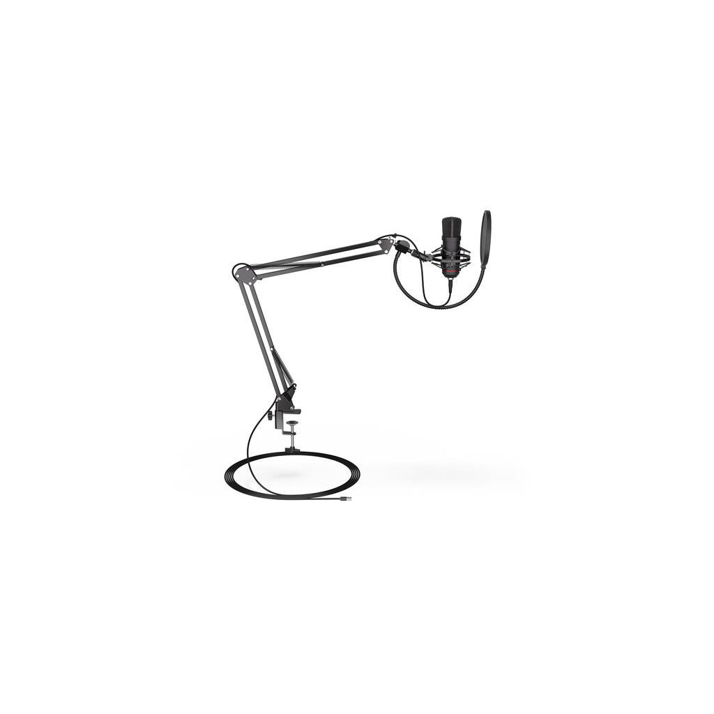 Set tohoto mikrofonu obsahuje nastavitelné rameno a USB kabel. Následující kroky připojení jsou jednoduché – připevněte jej ke svému stolu, zapojte do počítače a jste připraveni nahrávat. Tento frajer zvládne všechny vaše podcasty a streamy a navíc vypadá luxusně!