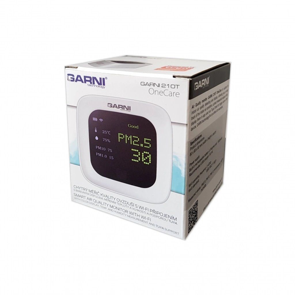 Chytrý měřič kvality vzduchu GARNI 210T OneCare s WiFi modulem měří a zobrazuje na svém barevném TFT LCD displeji naměřené hodnoty kvality vzduchu, teplotu a relativní vlhkost ve vnitřních prostorách. Je kompatibilní s platformou chytré domácnosti Tuya IOT. Umožňuje nahrávat naměřené hodnoty online, zobrazovat je v aplikaci Tuya Smart a prostřednictvím této aplikace automaticky spouštět jiná zařízení, např. chytré čističky vzduchu GARNI 15T OneCare a GARNI 45T OneCare. Pro měření pevných částic (PM), teploty a relativní vlhkosti jsou použita švýcarská čidla SENSIRION.