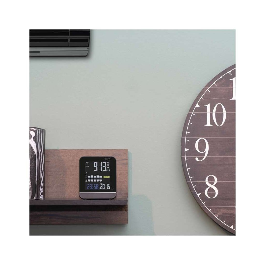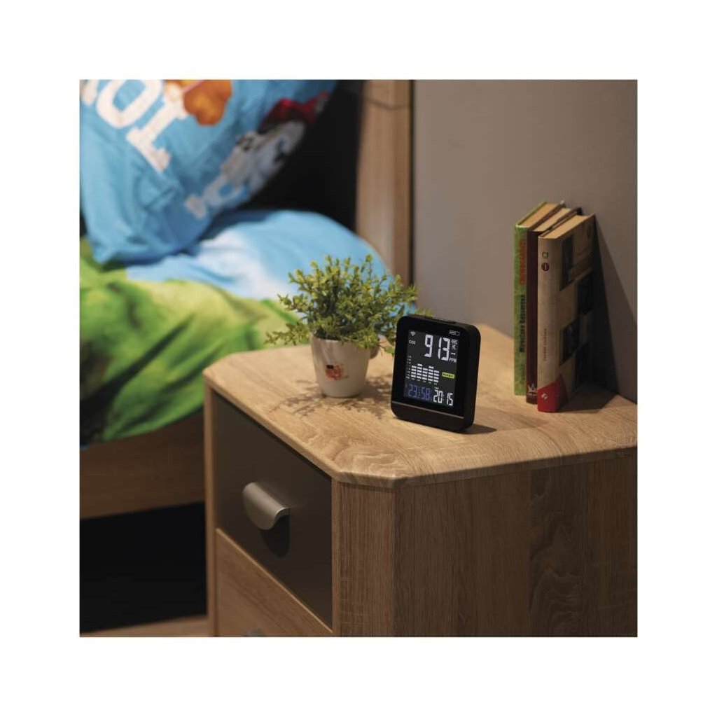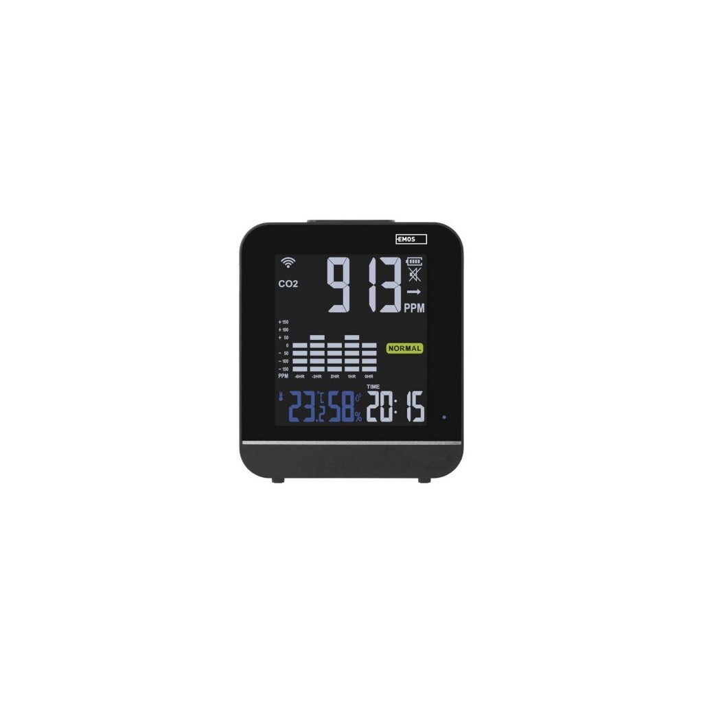 Gosmart monitor kvality ovzduší v sobě ukrývá mnoho užitečných funkcí. S jeho přehledným LED displejem, který je trvale podsvícen, získáte informace o současném stavu CO2 prostřednictvím tří různých barevných úrovní. Na displeji je také přehledně zobrazen aktuální čas, teplota a vlhkost v monitorované místnosti. V aplikaci EMOS GoSmart pak budete mít přehled o minimálních a maximálních hodnotách sledovaných ukazatelů. A bonus nakonec! Díky zobrazení hodin ho lze využít i jako budík.