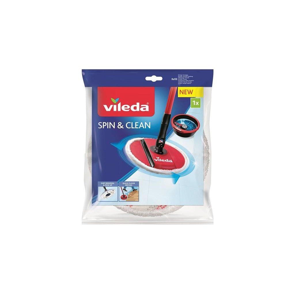 Návlek VILEDA SPIN & CLEAN 161822Náhrada plochého rotačního mopu Spin & Clean. Použitý materiál a struktura vláken spolu v kombinaci s unikátním systémem mytí a ždímání mopu Spin & Clean umožňují mycímu návleku dosažení velmi snadného odstranění a sběru nečistot z vaší podlahy. Náhradní mycí návlek jde velmi jednoduše vyměnit za nový. Mikrovlákna odstraní bakterie z povrchu jen za pomoci vody. Tenká mikrovlákna fyzicky perfektně přilnou k povrchu podlahy, kde zachytí nečistoty a více než 99 % bakterií* a odstraní je pryč bez nutnosti použití chemikálií.