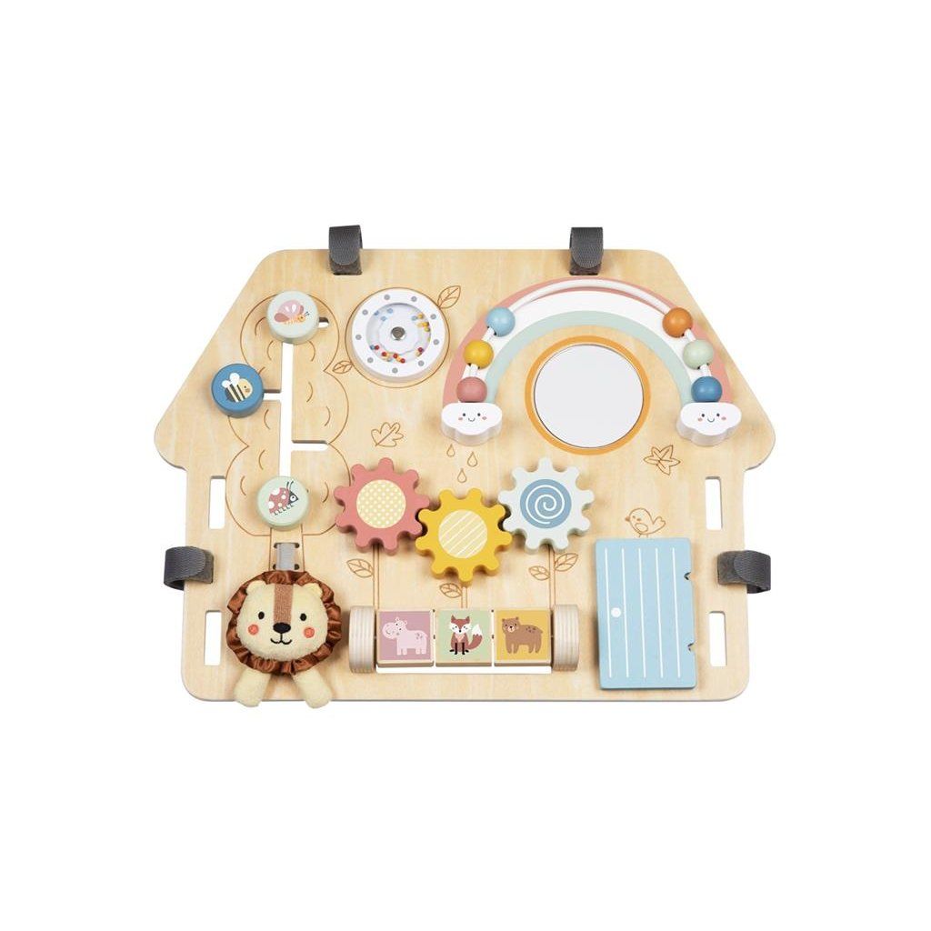 Tato hrací deska ve tvaru domečku s motivem lvíčka přináší spoustu zábavy, díky které bude moci Vaše dítě rozvíjet zručnost, zvídavost a jemnou motoriku. Různé aktivity jako je korálkový labyrint, ozubená kolečka, otáčecí a posuvné destičky s obrázky zvířátek a další dávají dítěti možnost procvičovat otáčení, otevírání či zavírání a připravit se tak na úkony každodenního života. Jemné barvy, roztomilé obrázky, zvuky, jako je chrastění perliček, a rozdílné textury povrchů stimulují smyslové vnímaní dětí. Deska je opatřena praktickými podpěrami ve tvaru trojúhelníku a je vyrobena ze dřeva s certifikací FSC®.