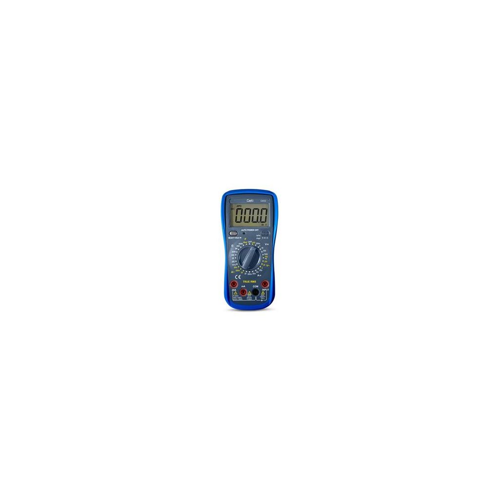 Multimetr GETI GM50G je profesionální přístroj vhodný k měření široké škály elektrických veličin jako jsou: napětí (DCV a ACV), proud (DCA a ACA), odpor, kapacita a další. Velký a podsvícený displej, zajišťuje snadné a dokonalé čtení zobrazených údajů i za zhoršených světelných podmínek. Přístroj je také vybaven dalšími praktickými funkcemi, jako je indikace slabé baterie, ochrana proti přetížení, testování diod nebo měření kontinuity, které dodávají multimetru uživatelsky přívětivý charakter. Díky svému tvaru a kompaktním rozměrům zaručuje tento přístroj snadnou a přesnou manipulaci. Všechny tyto vlastnosti z tohoto multimetru činí ideální přístroj nejen pro profesionály, ale také dílny a domácnosti.