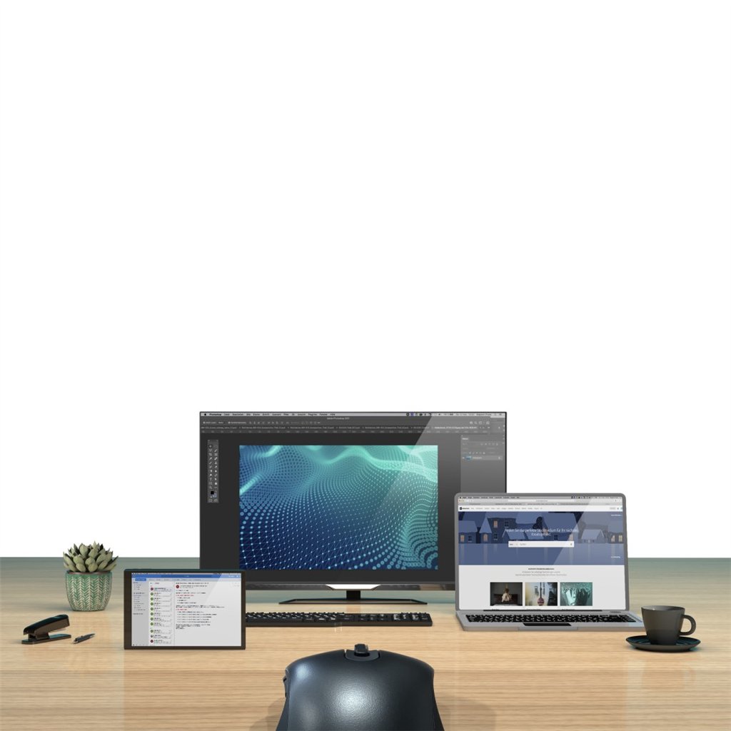 - optická 6tlačítková Multi Device myš s volitelným připojením na tři zařízení: 1x bezdrátově (2,4Ghz technologie – USB-A přijímač) a 2x pomocí Bluetooth (BT 3.0 a 5.0)