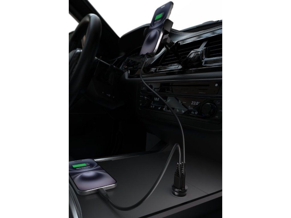 Autonabíječka automaticky detekuje připojené zařízení a přizpůsobí mu optimální nabíjecí výkon. Kompaktní rozměry zajišťují, že nabíječka téměř nevyčnívá ze zásuvky a nepřekáží ani v menších interiérech vozidla. Odolná konstrukce z polykarbonátu a ABS plastu vydrží každodenní používání a náročné podmínky v autě.