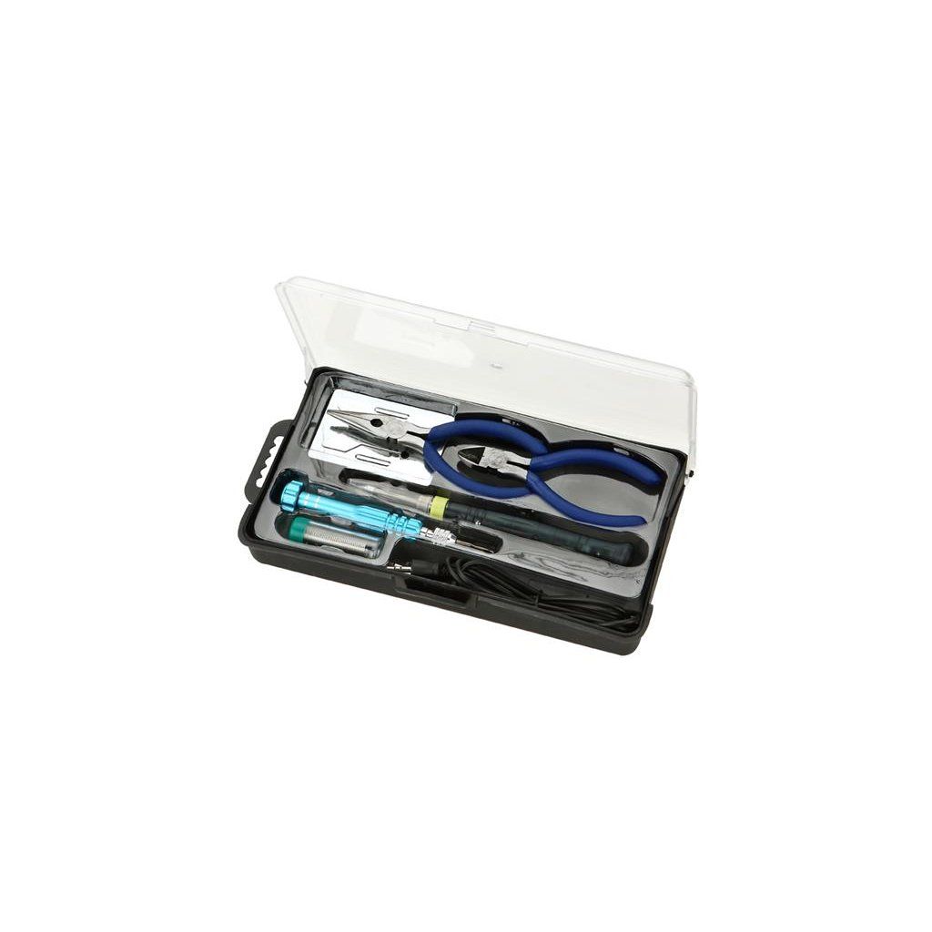 - sada obsahuje: pájka s kalafunou, šroubovák s měnitelnými nástavci, tenké kleště 5", štípací kleště 4,5", USB páječka 5V /8W, kovový stojan