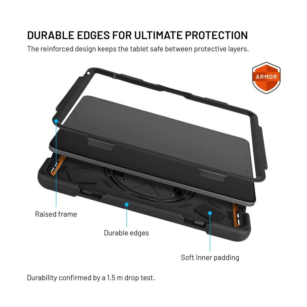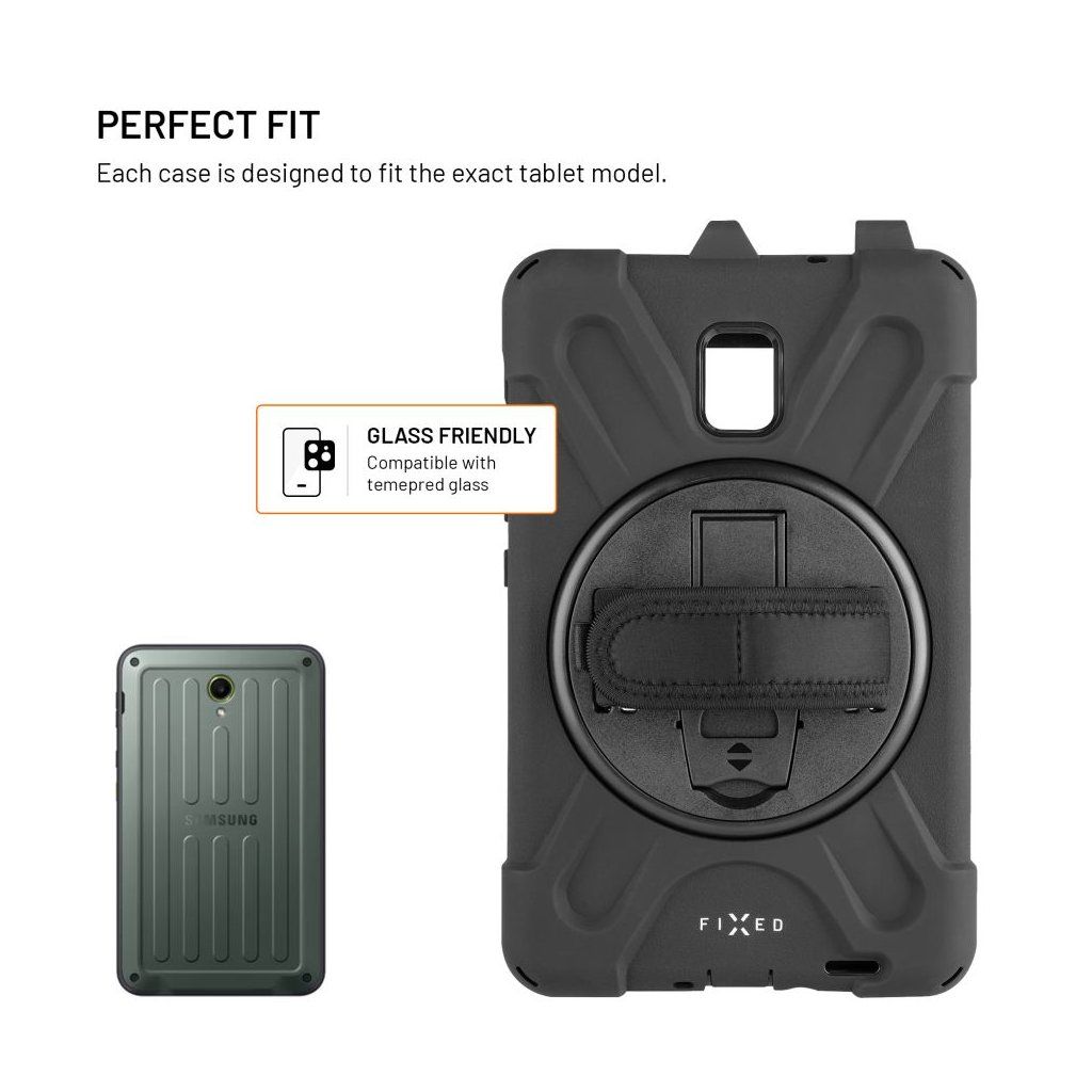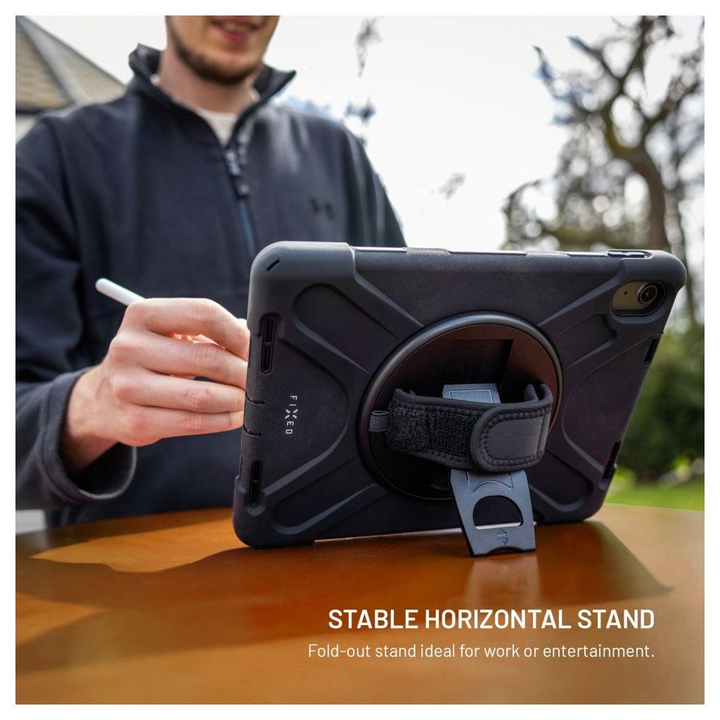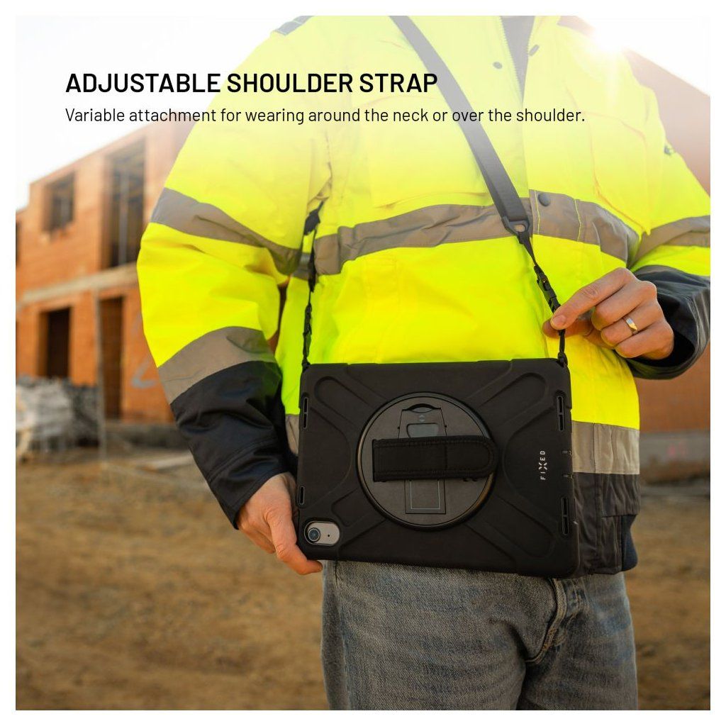 Extra odolné pouzdro FIXED Rugged Tab je navrženo pro maximální ochranu tabletu, které bez problémů odolá pádům, nárazům i každodennímu opotřebení. Zesílená konstrukce rohů a boků spolehlivě absorbuje otřesy, zatímco vyvýšené okraje displeje chrání proti poškození při položení čelní stranou dolů. Vnitřní silikonové polstrování poskytuje dodatečné tlumení nárazů a ochranu tabletu. Na zadní straně pouzdra se nachází otočná rukojeť, která výrazně usnadňuje držení a manipulaci s tabletem. Rukojeť lze otáčet o 360°, takže si ji snadno nastavíte do libovolné pozice a pomocí suchého zipu si pásek rukojeti přizpůsobíte jakékoli velikosti ruky. Rukojeť zároveň slouží jako praktický stojánek – stačí ji vyklopit a tablet stabilně postavit do horizontální polohy, ideální pro sledování videí, videohovory nebo práci na cestách. Součástí balení je také odnímatelný a nastavitelný popruh, který lze připevnit do libovolného rohu pouzdra a umožňuje tak pohodlné nošení přes rameno nebo kolem krku. Pouzdro je navíc vybaveno slotem pro stylus, ochranou konektorů a díky přesnému zpracování je plně kompatibilní i s tablety opatřenými ochranným sklem. FIXED Rugged Tab poskytuje maximální ochranu tabletu, ať jste na stavbě, v terénu nebo na cestách.Vlastnosti: