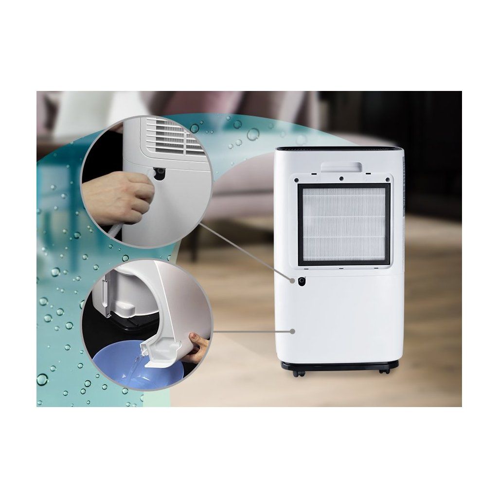 Vysokého výkonu dosahuje při pokojové teplotě 30 °C a 80% relativní vlhkosti, kdy ze vzduchu odsaje až 25 l za 24 hodin, při pokojové teplotě 27 °C a 60% relativní vlhkosti odsaje 12,4 l za 24 hodin. Objem zachycené nádoby na vodu je 4 l. Po naplnění této nádržky se odvlhčovač automaticky vypne. Nepřetržitý provoz je umožněn stálým odtokem vody pomocí hadice, která je součástí balení. Samozřejmostí je 12hodinový časovač, kde si můžete nastavit dobu provozu podle svých potřeb.
