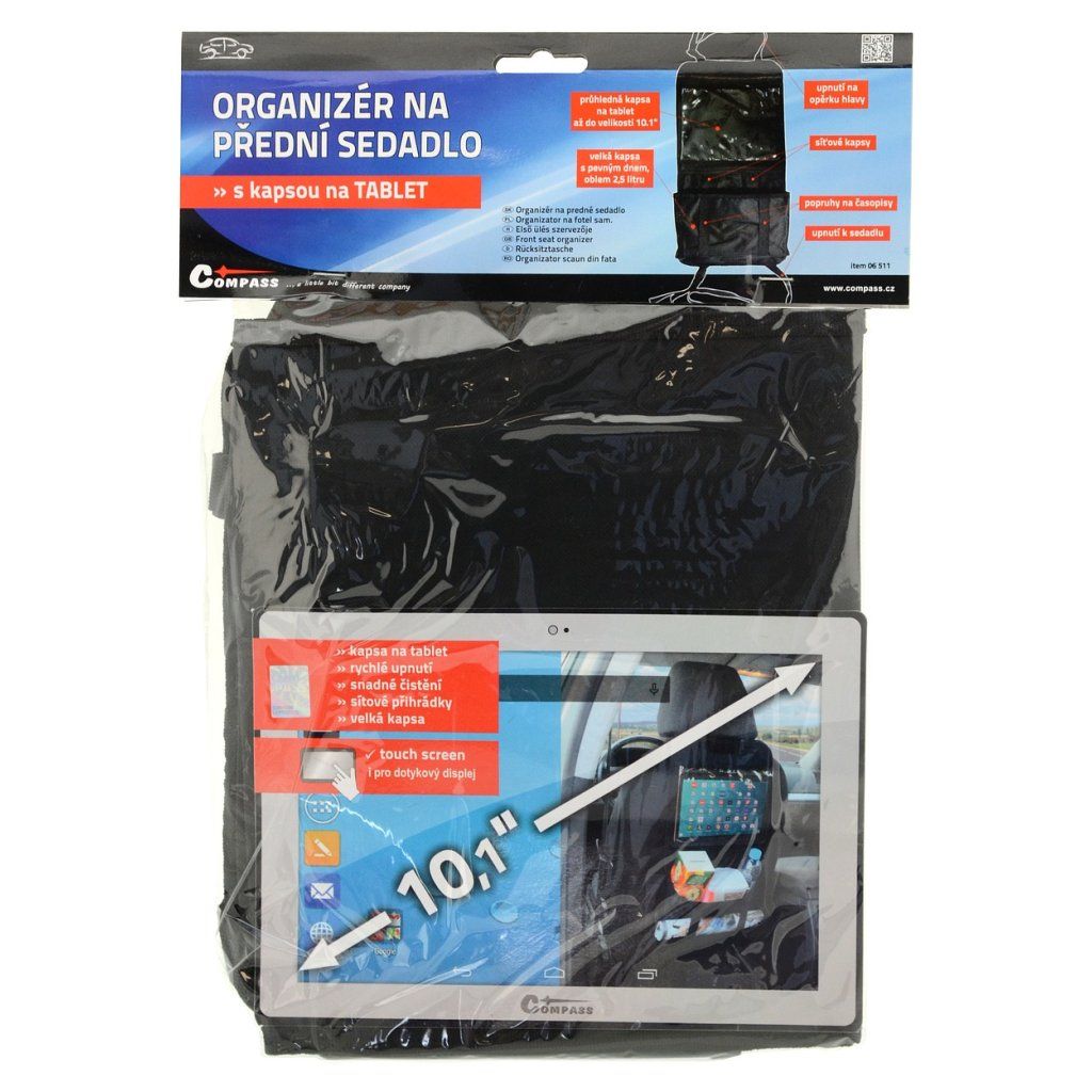 Organizér k připevnění na zadní stranu předního sedadla. Upevnění horní části pomocí popruhů za opěrku hlavy, spodní části popruhy za sedadlo.