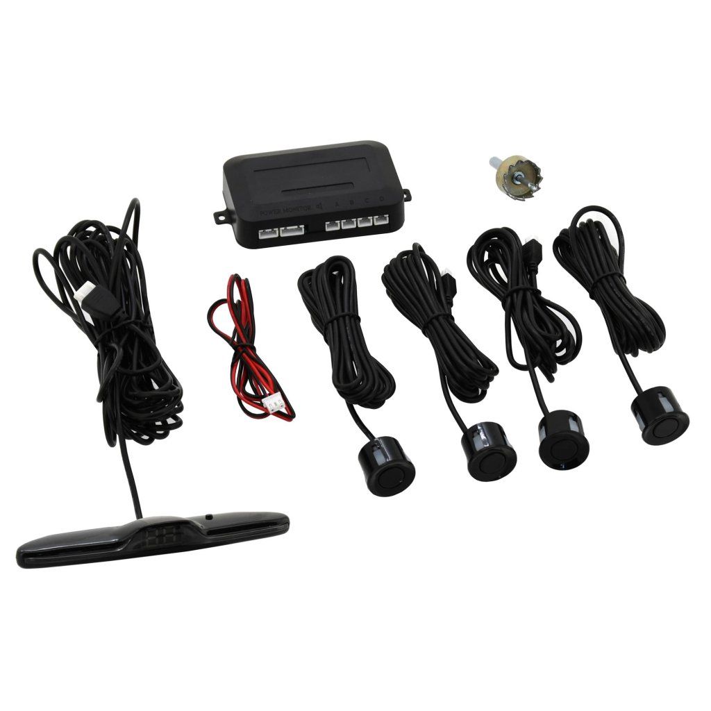 Balení obsahuje displej, řídící jednotku, 4 senzory pro montáž do zadního nárazníku, odpovídající kabeláž a vrták odpovídajícího průměru.