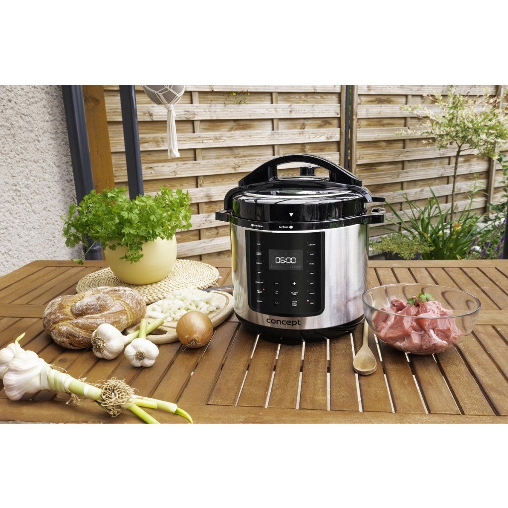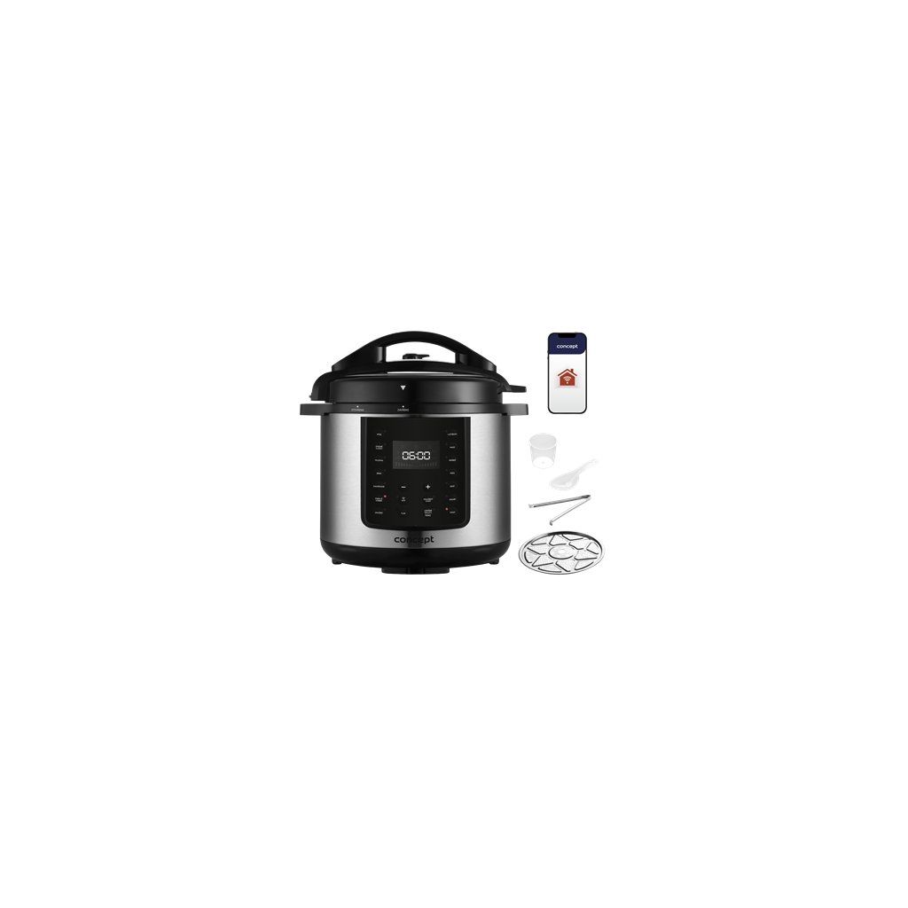 Multifunkční tlakový hrnec Concept CK8001 s WiFi připojením představuje moderní způsob vaření. S objemem 5,6 l s ním pohodlně uvaříte jídlo až pro 6 osob, takže zasytí i velkou rodinu. Zastane práci tlakového, parního, pomalého, zavařovacího i sous-vide hrnce, rýžovaru, polévkovaru a jogurtovače. S CK8001 připravíte snadno a rychle téměř cokoliv, na co si vzpomenete – od polévky až po sladký dezert.