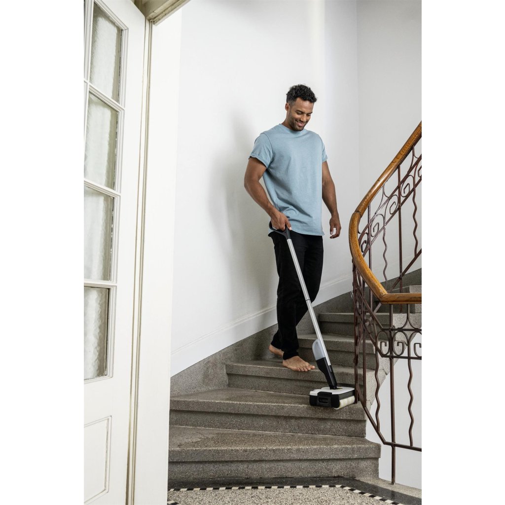 Podlahová myčka FC 2-4 je skvělým pomocníkem při úklidu díky své samonosné konstrukci a lehké váze pouhých 2,2 kg. Díky automatickému zapínání a vypínání je ovládání velmi intuitivní – stačí jednoduše zatáhnout za rukojeť čističe směrem dozadu a myčka se sama spustí. V jediném kroku pak snadno odstraní suché i mokré každodenní nečistoty. Baterie vystačí až 20 minut čištění, což je dostačující pro úklid plochy o rozloze cca 70 m2. Válec myčky se po aktivaci automaticky navlhčí vodou z nádrže na čerstvou vodu, což zajišťuje rovnoměrné a efektivní čištění tvrdých podlah vždy čistou vodou. Myčka umožňuje čištění až po okraj a díky integrovaným vlasovým filtrům lze snadno sbírat i vlasy a další nečistoty. Integrovaná hygienická nádrž na špinavou vodu zamezuje kontaktu s nečistotami a po použití ji lze snadno vyjmout a vyčistit. Přiložená výměnná baterie 4V od Kärcher Battery Power je kompatibilní se všemi 4V zařízeními této značky.