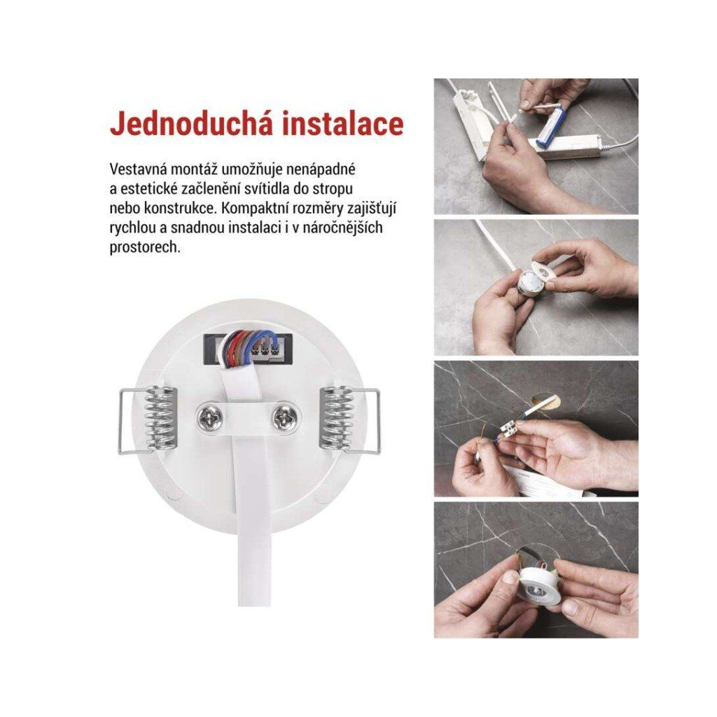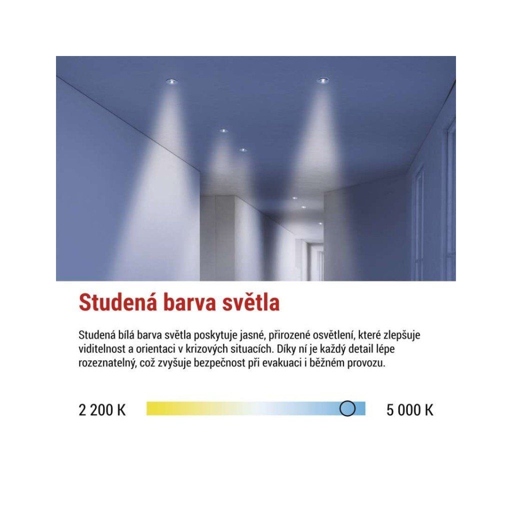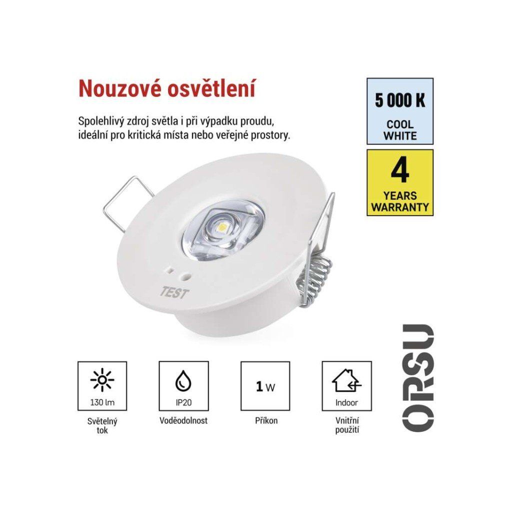 barva světla: studená bílá|barva těla: bílá|délka zálohy: 3 h|doba nabíjení baterie: ? 24 hodin|frekvence napájecího napětí: 50/60 Hz|kapacita baterie: 1 500 mAh|kontrolní vybavení: autotest|krytí: IP20|materiál difuzoru: –|materiál těla: plast (PC)|napájecí napětí: 220–240 V AC|pozorovací vzdálenost: –|příkon na vstupu: 1 W|prodejní obal: 1 ks, krabice|provozní režim: pohotovostní|rozměr: průměr 50 × 17 mm|rozsah pracovních teplot: 0 °C až +45 °C|stupeň ochrany proti mechanickým nárazům: –|světelný tok: 130 lm|teplota chromatičnosti: 6 500 K|třída ochrany: II|typ baterie: LiFePo4|typ montáže: vestavná|účiník: >0,5|vstupní proud: 75 mA|výstupní napětí: –|výstupní napětí v nouzovém režimu: –|výstupní výkon v nouzovém stavu: 1 W|záruční doba: 4 roky|záruka na baterii: 2 roky|zdroj světla: LEDDoplňkové parametry