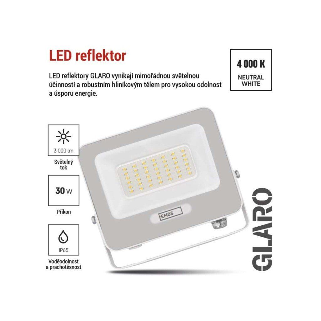 LED reflektor GLARO 30W je kompaktní venkovní svítidlo určené pro osvětlení domů, zahrad, příjezdových cest nebo menších venkovních ploch. Nabízí světlý výkon 3 000 lm při příkonu 30 W a krytí IP65, což zajišťuje odolnost proti dešti a prachu. Díky hliníkovému tělu a skleněnému difuzoru je reflektor navržen pro spolehlivý provoz v běžných venkovních podmínkách.