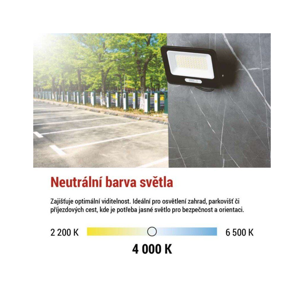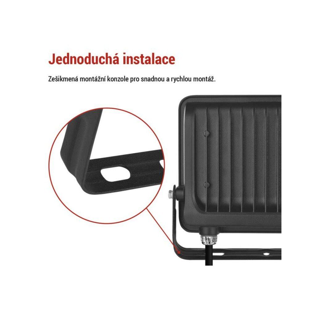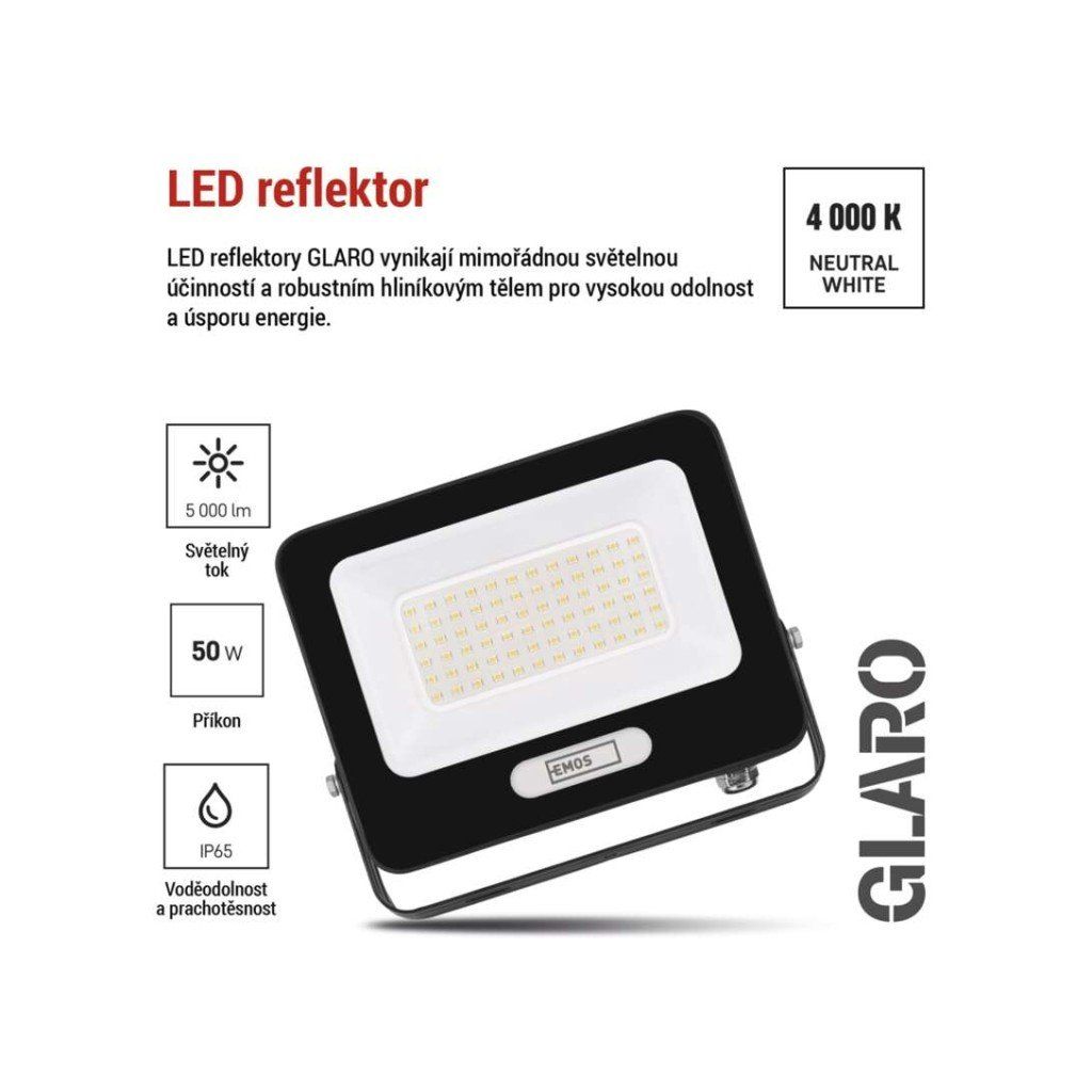 LED reflektor GLARO s příkonem 50 W poskytuje stálé a efektivní osvětlení s světelným tokem 5 000 lm a neutrální bílou barvou světla (4 000 K). Díky krytí IP65 a odolnému hliníkovému tělu je reflektor určen pro venkovní použití, odolává dešti, prachu a běžným povětrnostním vlivům. Jednoduchá montáž a nastavitelná montážní konzole umožňují rychlé nasměrování světla tam, kde je potřeba.