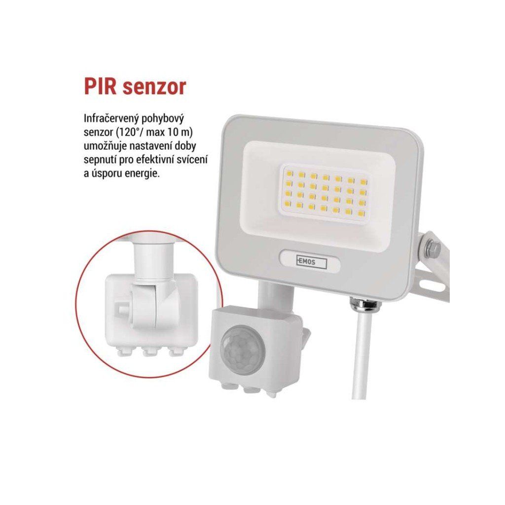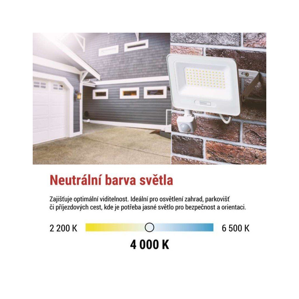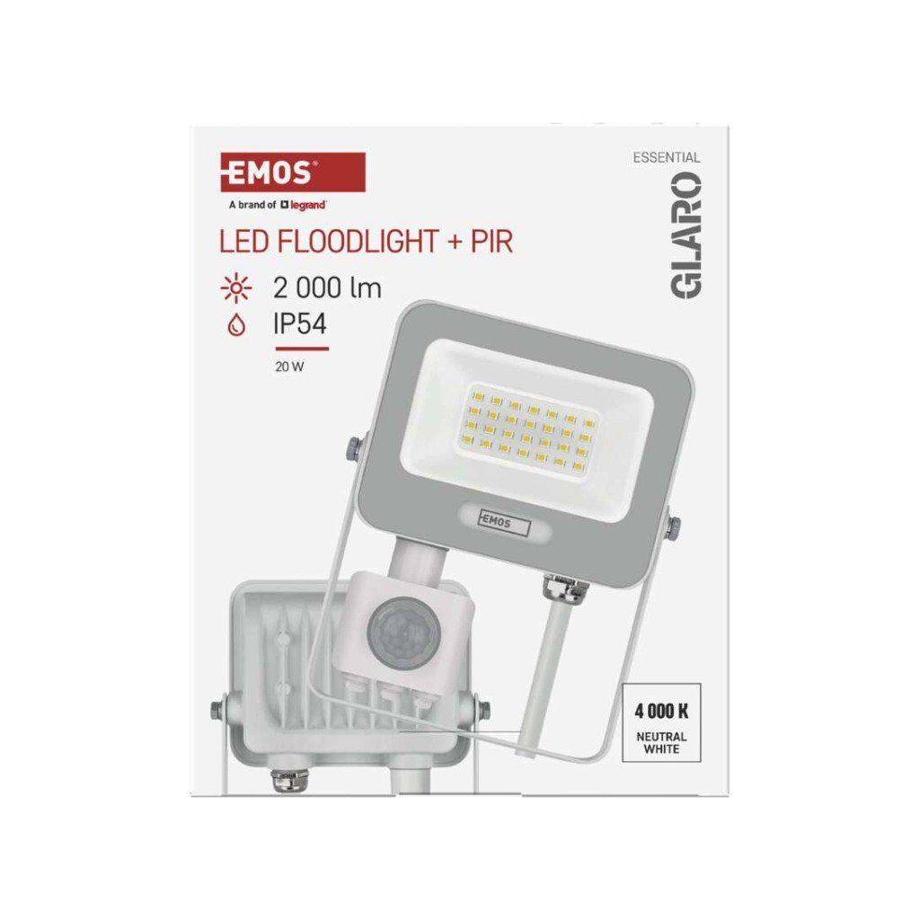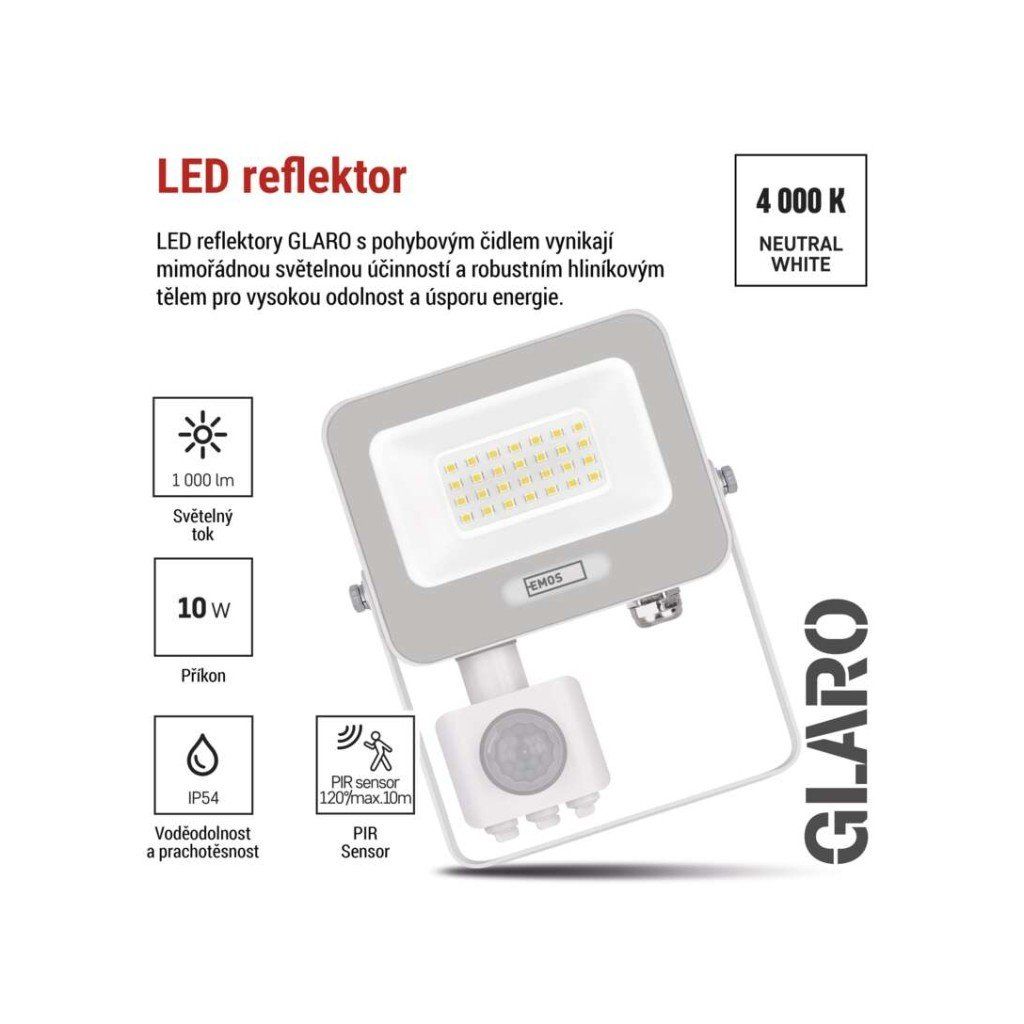 LED reflektor GLARO s integrovaným PIR senzorem je určen pro praktické a úsporné venkovní osvětlení v okolí vstupů, garáží, příjezdových cest a zahradních cest. Reflektor automaticky sepne při detekci pohybu, nabízí neutrální bílou barvu světla 4 000 K a krytí IP54, což zajišťuje odolnost vůči stříkající vodě a prachu při použití na fasádách nebo pod přístřešky.