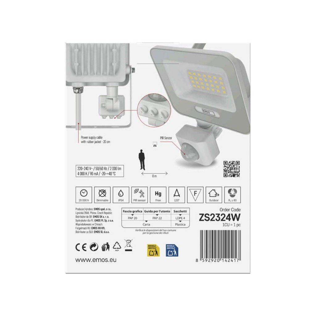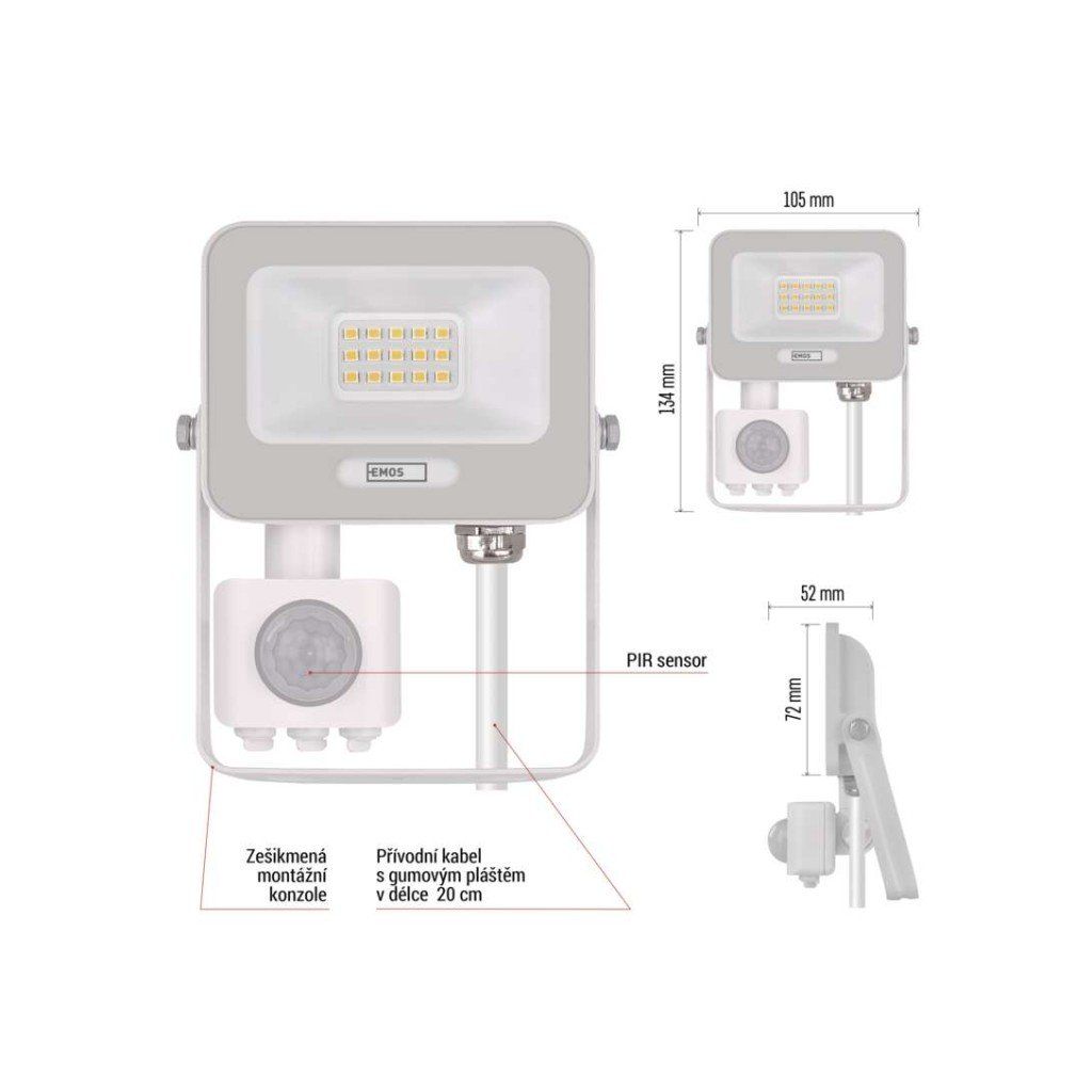 - PIR senzor: Reflektor je vybaven senzorem pohybu, který automaticky aktivuje světlo při detekci pohybu. Umožňuje pohodlné a úsporné osvětlení bez nutnosti manuálního spínání.