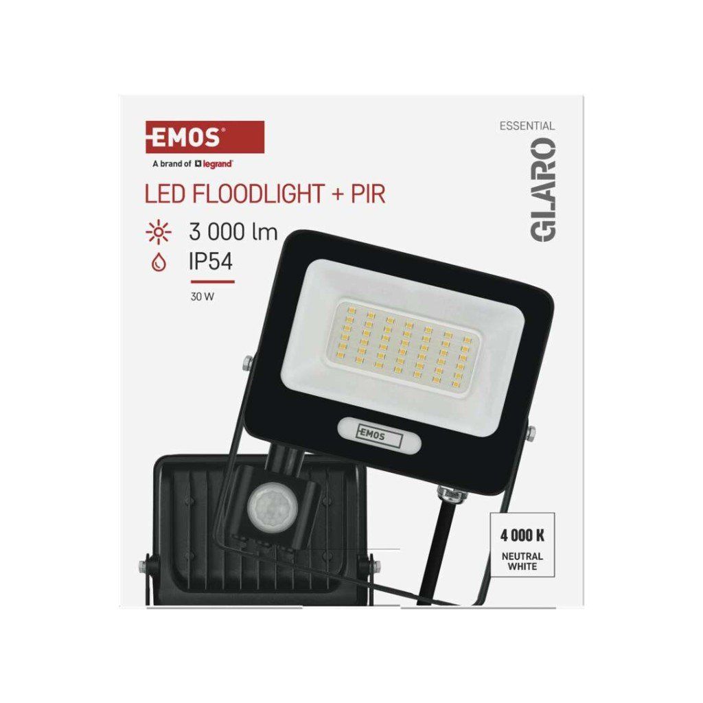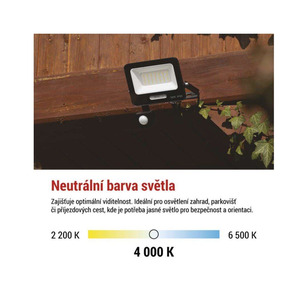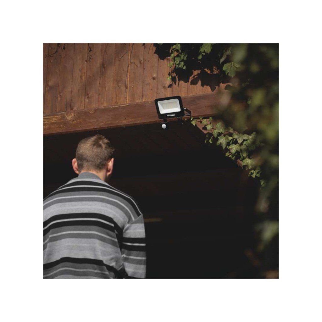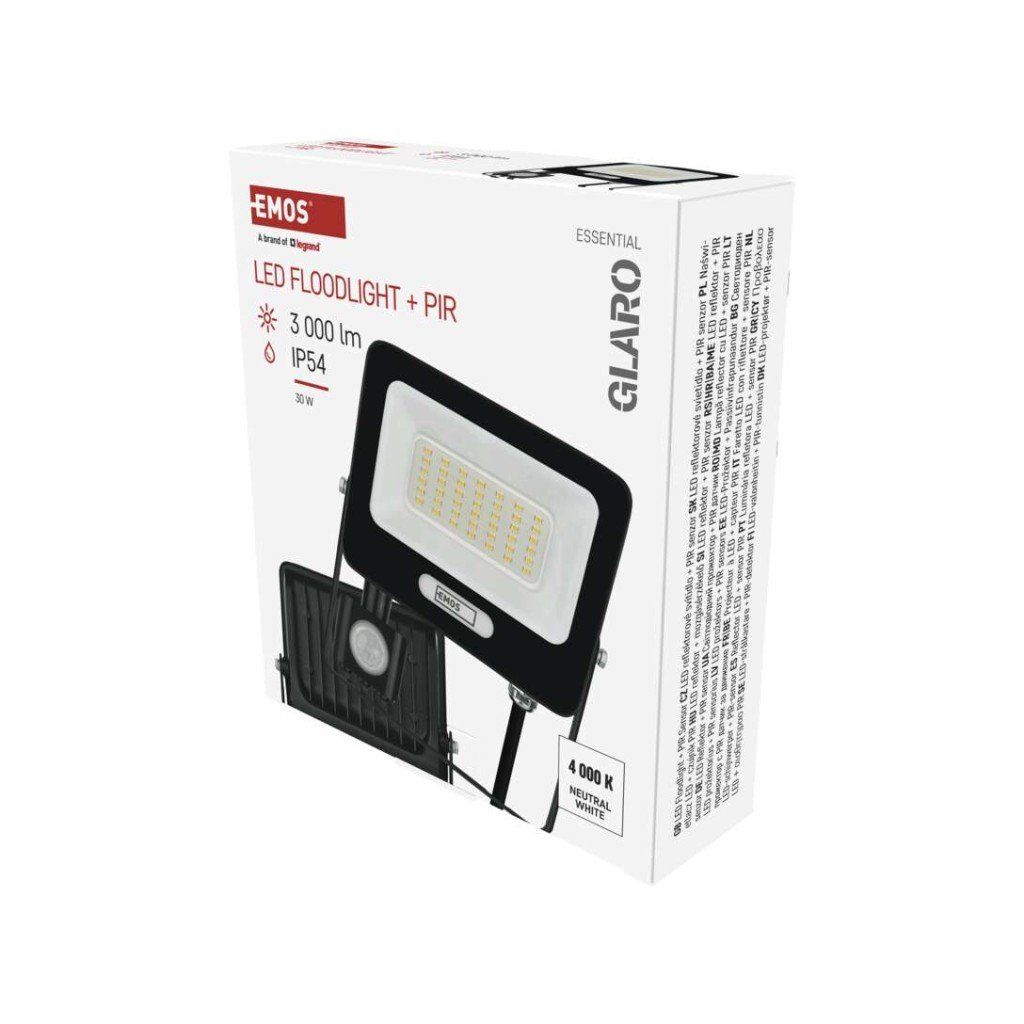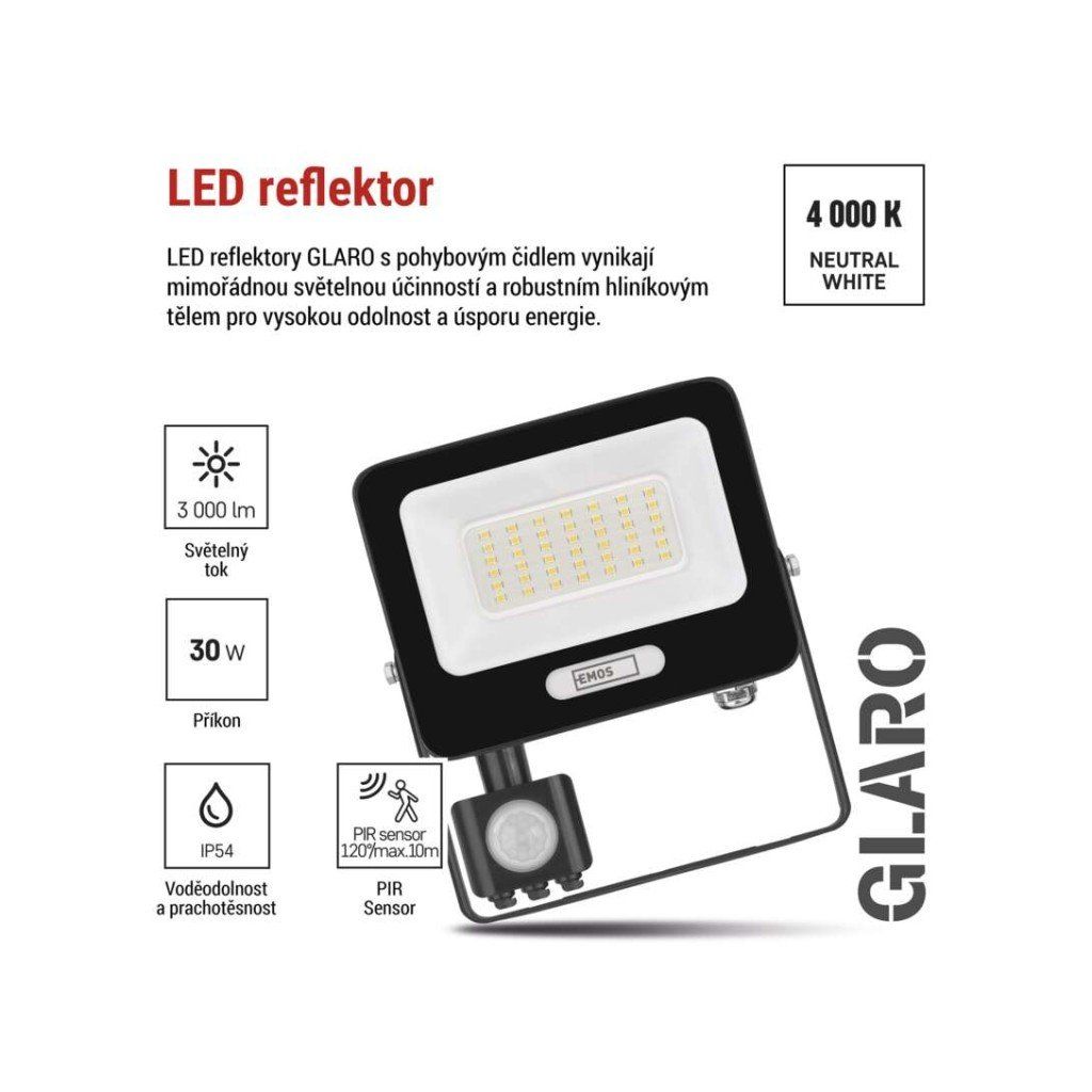 LED reflektor GLARO s integrovaným PIR senzorem je určený pro praktické venkovní osvětlení vstupů, garáží, příjezdových cest a zahradních ploch. Díky příkonu 30 W a světelnému toku 3 000 lm poskytuje dostatečné a rovnoměrné světlo v neutrální bílé (4 000 K) barvě, přičemž PIR senzor zajišťuje automatické sepnutí při detekci pohybu. Krytí IP54 a konstrukce z hliníku s skleněným difuzorem umožňují použití na stěně i pod střechou.