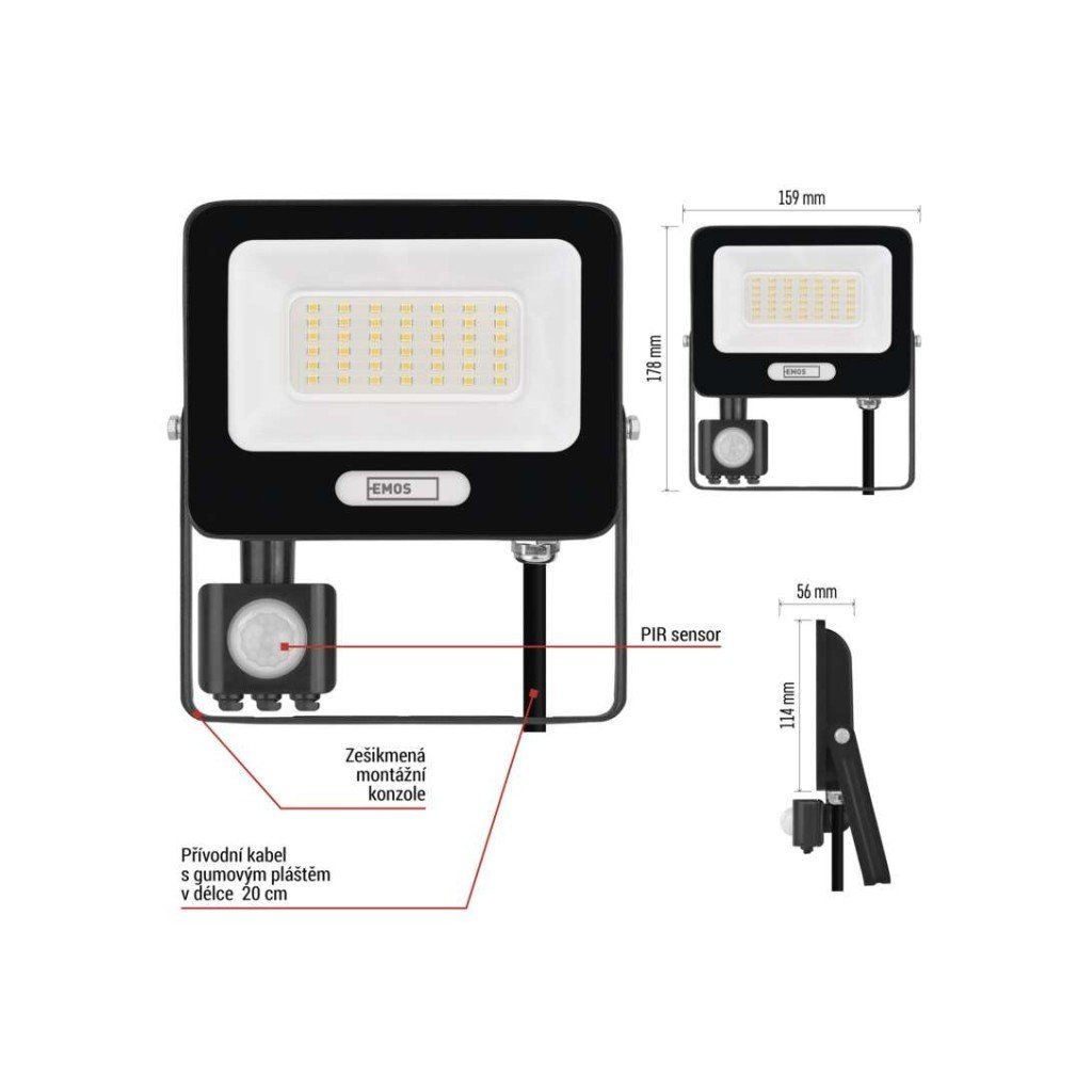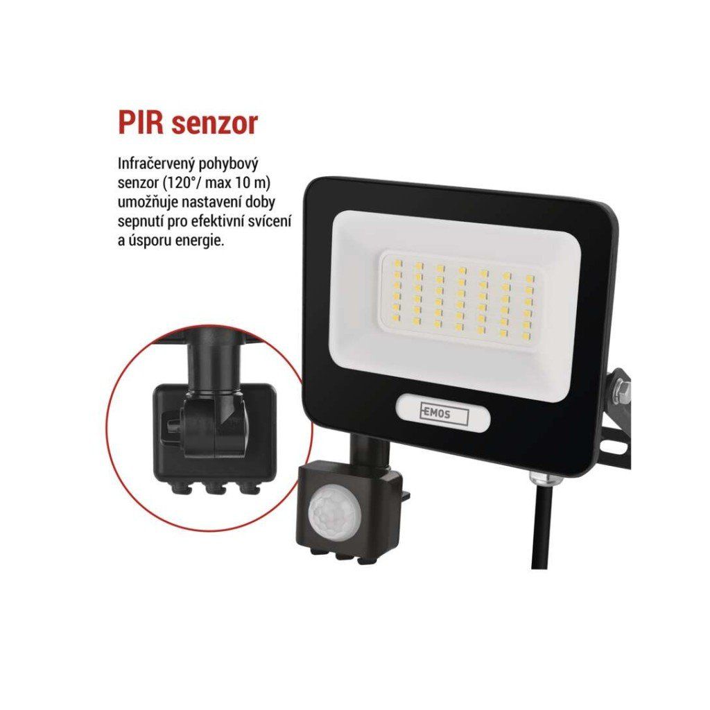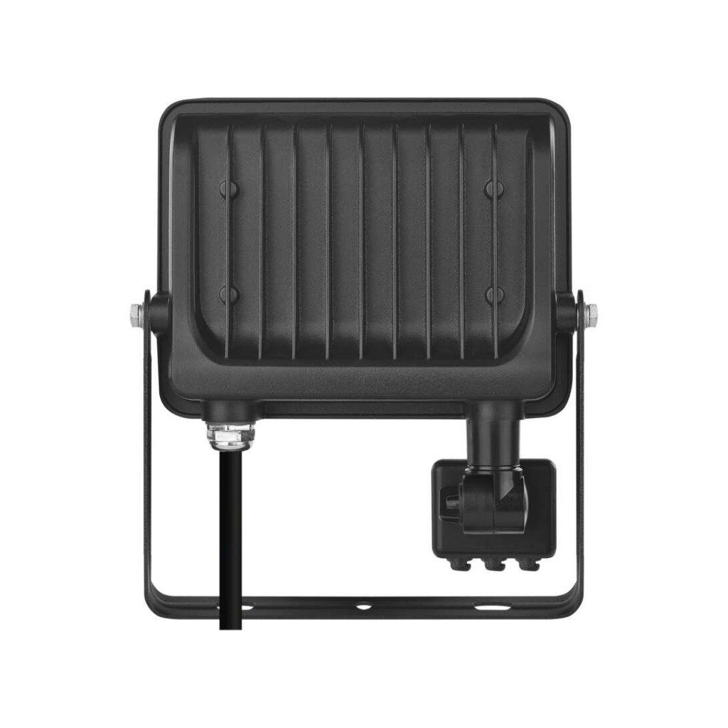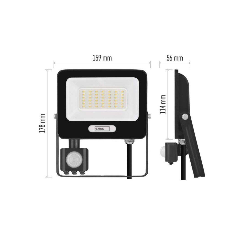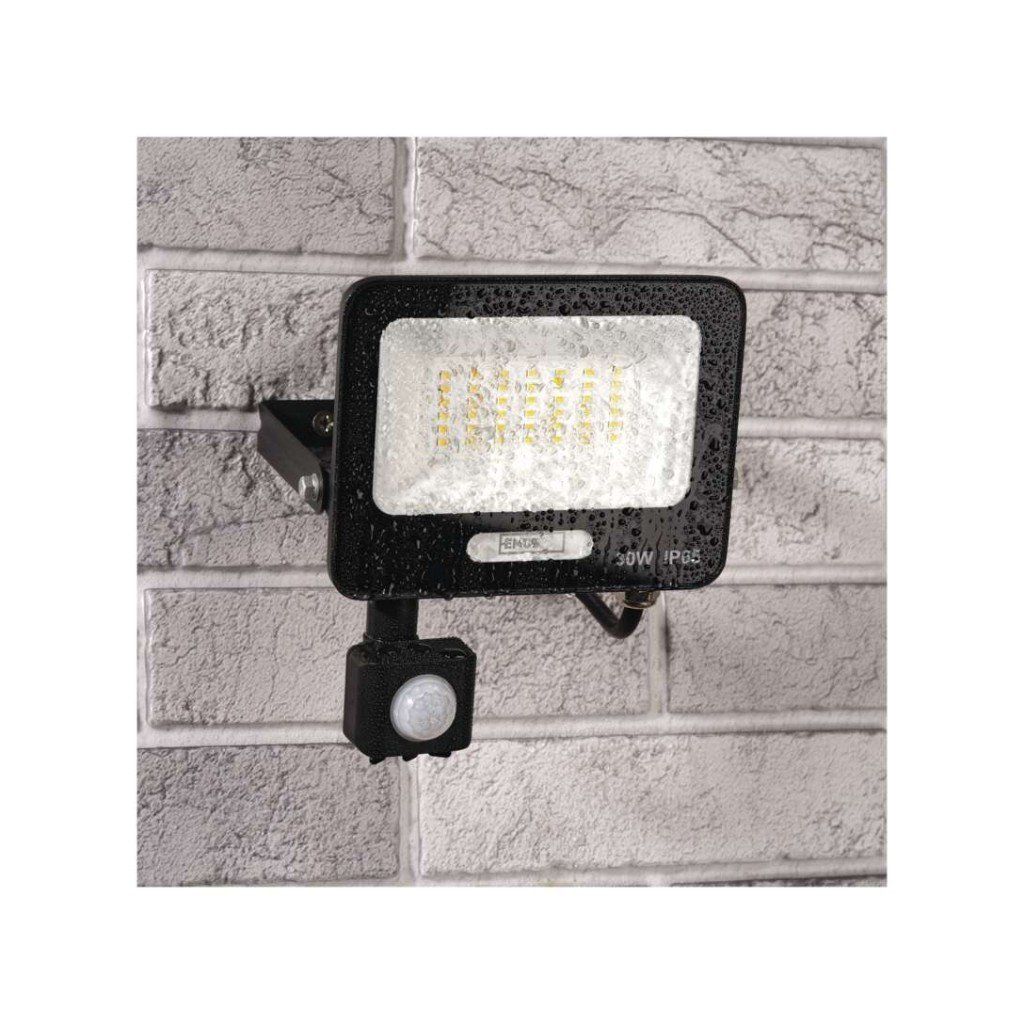 LED reflektor GLARO s integrovaným PIR senzorem je určený pro praktické venkovní osvětlení vstupů, garáží, příjezdových cest a zahradních ploch. Díky příkonu 30 W a světelnému toku 3 000 lm poskytuje dostatečné a rovnoměrné světlo v neutrální bílé (4 000 K) barvě, přičemž PIR senzor zajišťuje automatické sepnutí při detekci pohybu. Krytí IP54 a konstrukce z hliníku s skleněným difuzorem umožňují použití na stěně i pod střechou.