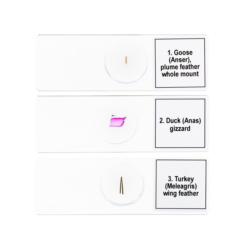 - Pět vzorků připravených k použití pro důkladné studium třídy ptáků