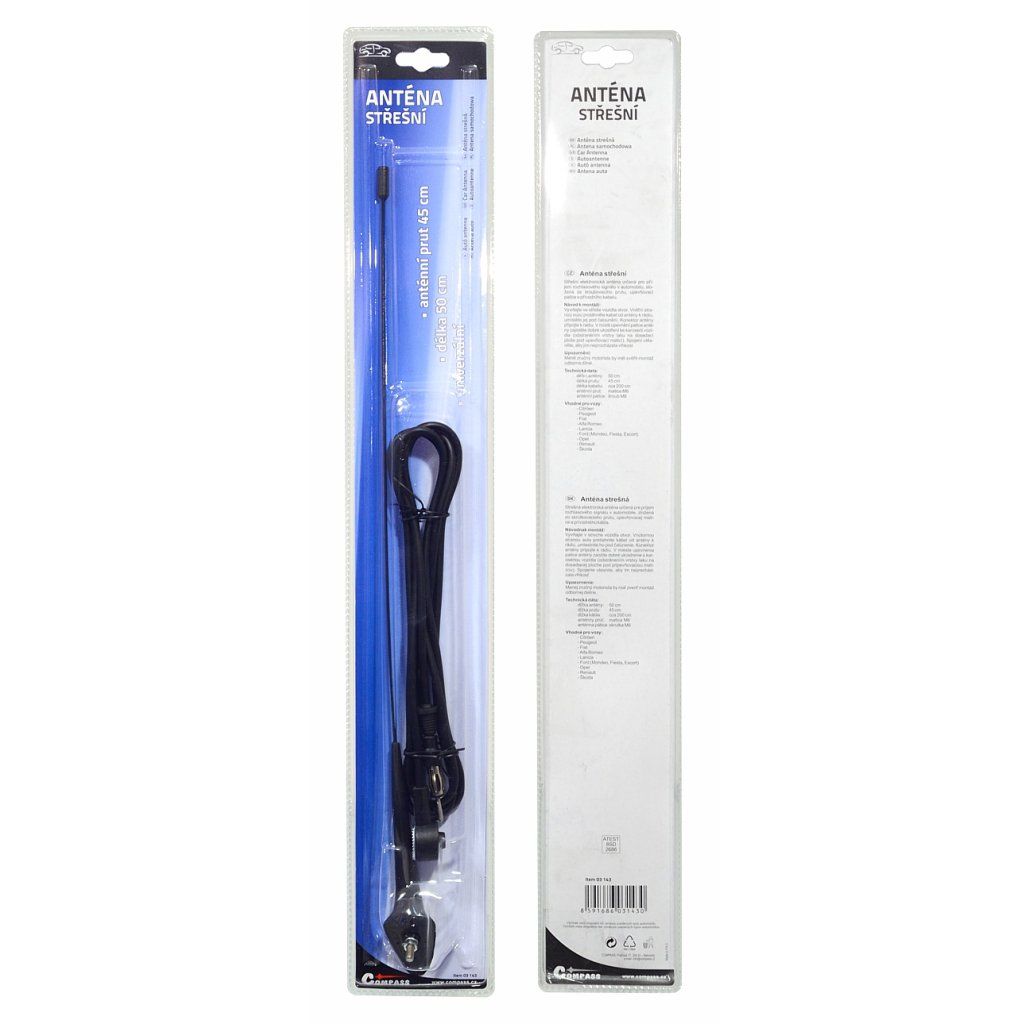 Střešní anténa určená pro příjem rozhlasového signálu v automobilu, složená ze šroubovacího prutu, upevňovací patice a přívodního kabelu. Délka prutu: 45 cm; délka kabelu: 200 cm; anténní prut: matice M6; anténní patice: šroub M6.