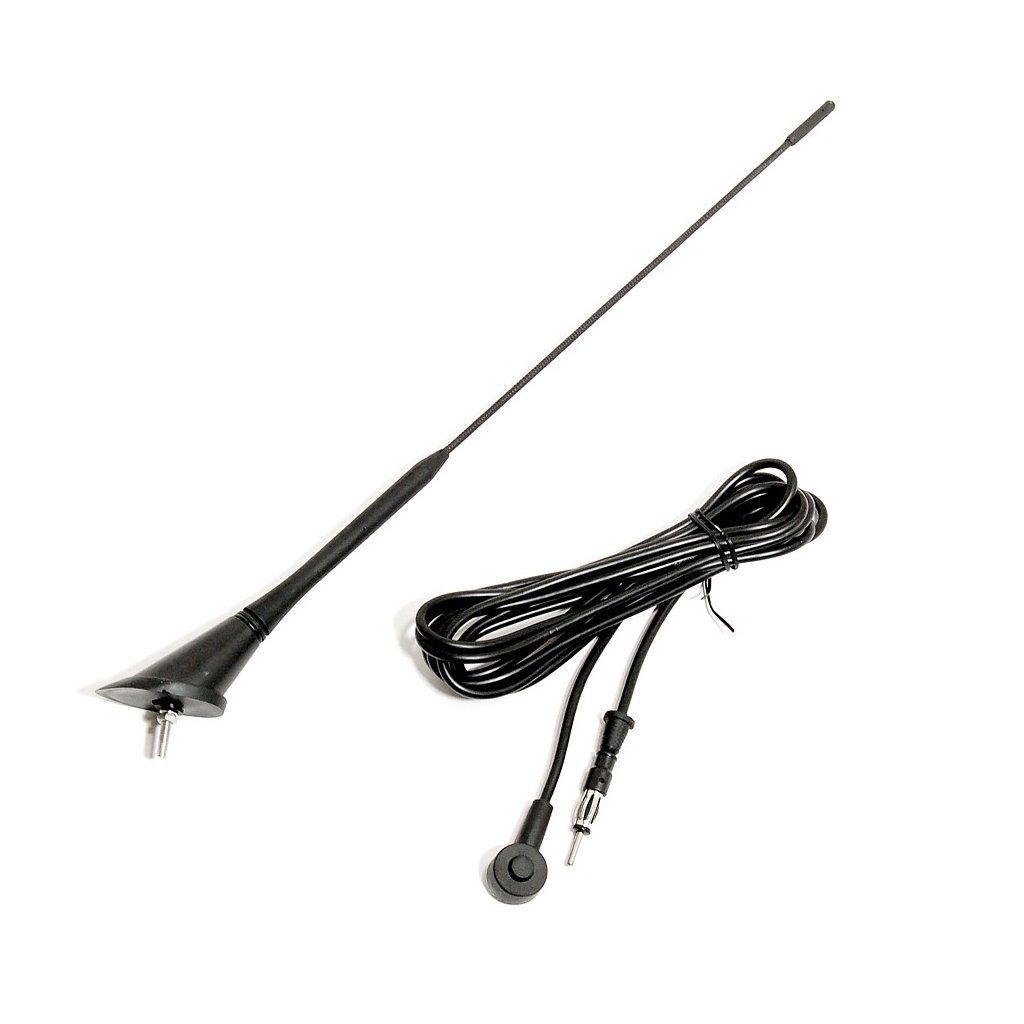 Prutová střešní laminátová anténa určená pro příjem rozhlasového signálu v automobilu, složená ze šroubovacího prutu, upevňovací patice a přívodního kabelu. Délka prutu 40 cm, délka kabelu 330cm, sklon antény 52°.