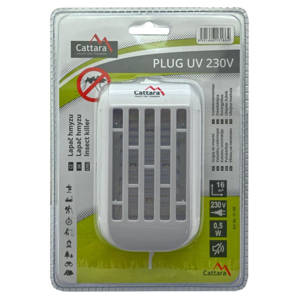 Elektronický lapač hmyzu k uchycení (zapojení) do zásuvky 230V, využívající UV LED k přilákání létavého hmyzu. Hmyz je po kontaktu s kovovou sítí pod vysokým napětím zahuben elektrickým proudem.