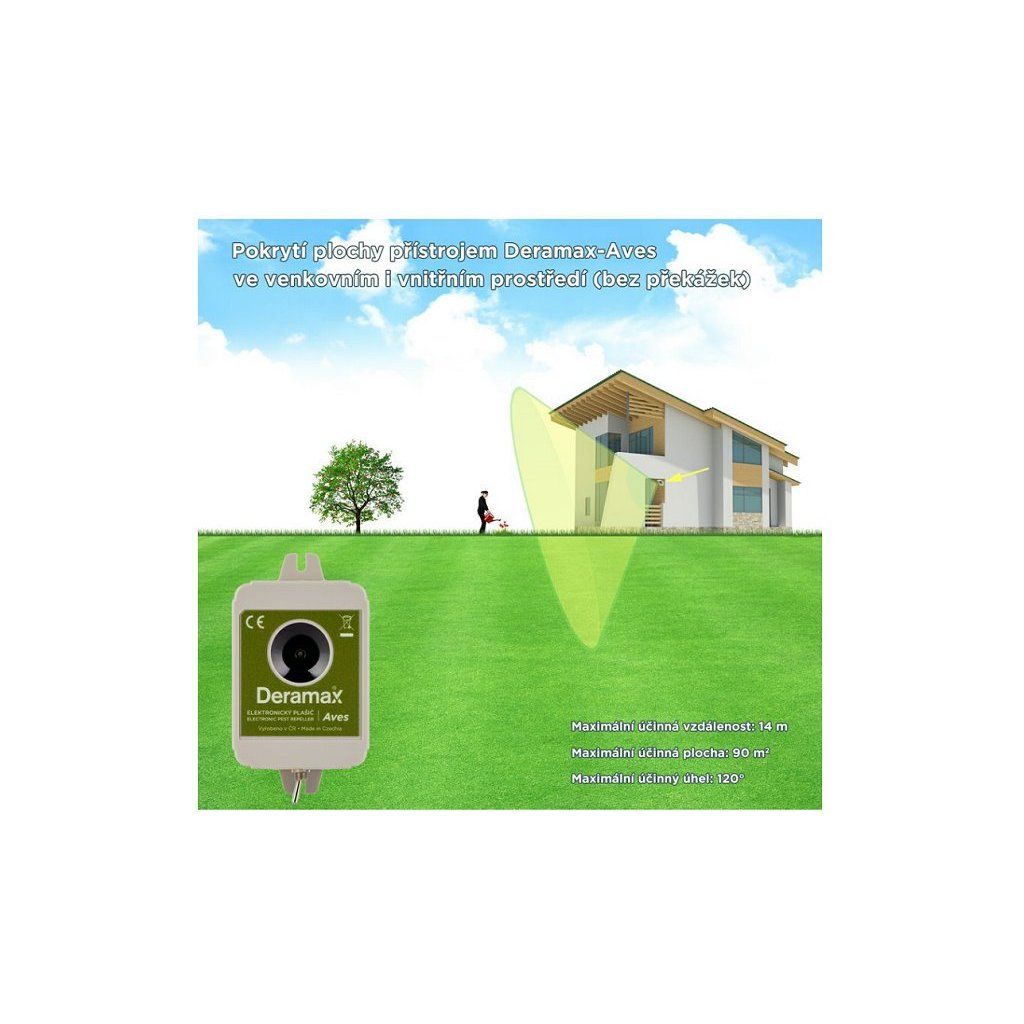 Plašič generuje signál v subultrazvukové oblasti (oblast vysokofrekvenčního hluku). Z hlediska vlivu na člověka plašič Deramax-Aves neruší své okolí nepříjemným hlukem a splňuje zákonné limity stanovené pro max. hladinu vysokofrekvenčního hluku i ultrazvuku. Vliv na domácí a hospodářská zvířata: Tento plašič (odpuzovač) má v rámci svého účinného dosahu negativní vliv i na domácí kočky a psy. Není ale nutné řešit nějaká zvláštní opatření stran domácích zvířat. Zcela postačuje, když má domácí zvíře možnost volně odejít z prostoru chráněného přístrojem. Plašič tedy vašemu domácímu zvířeti neublíží, jen se bude zvíře tomuto prostoru vyhýbat. Vždy ale dbejte, aby domácí zvíře mělo možnost odejít z chráněného prostoru, a nikdy nesmí být tento typ plašiče použitý proti zvířeti zavřenému v kotci apod.