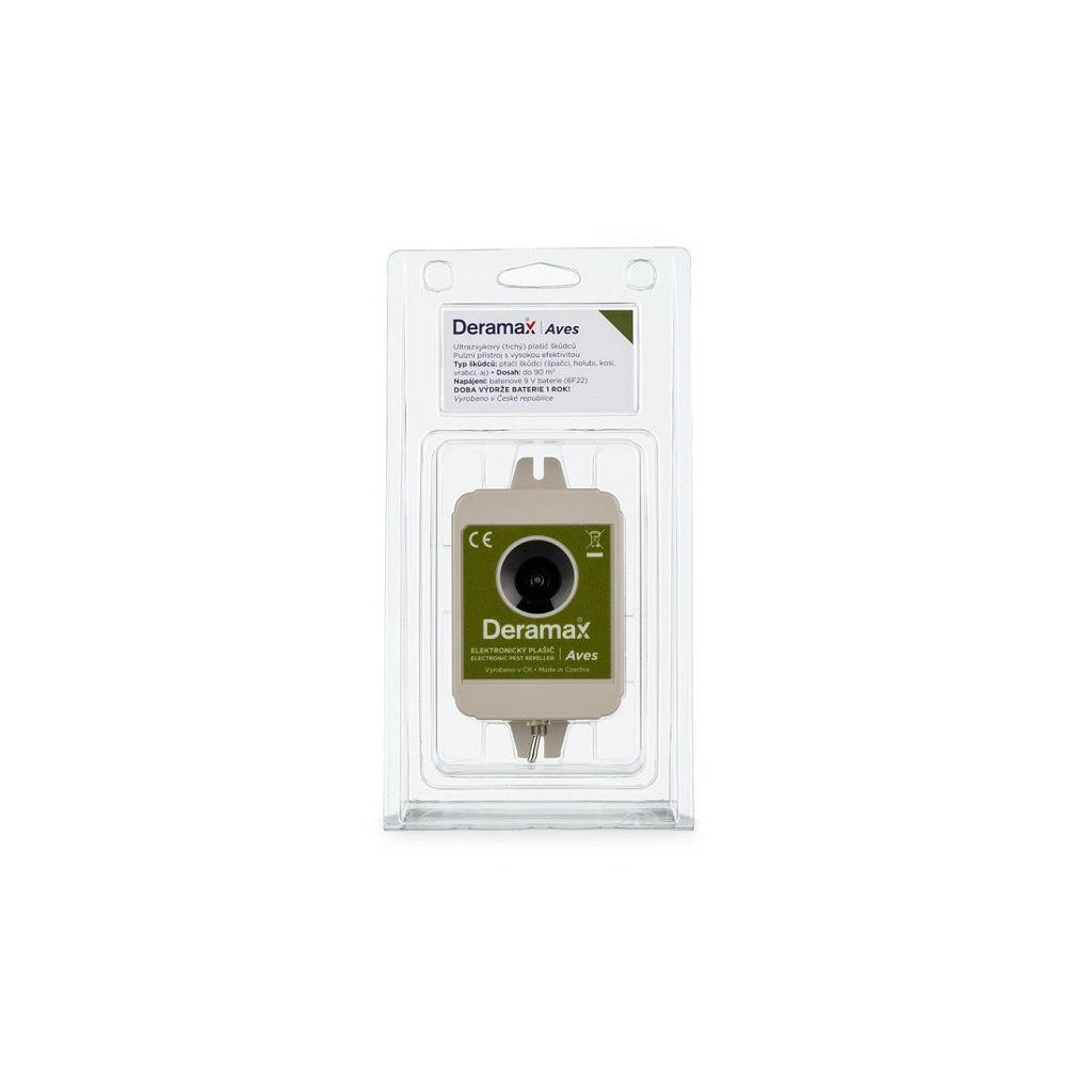 Deramax-Aves je plašič s bateriovým napájením pomocí běžné 9 V baterie. Doporučujeme použít 9 V lithiovou baterii, která udrží přístroj v chodu 12 měsíců.