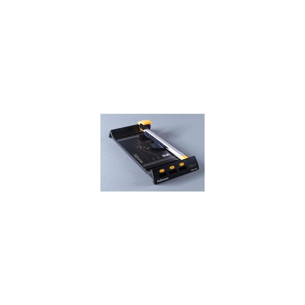 Řezačka papíru s plastovou základnou, velice atraktivní design v kombinaci černá žlutá. Kapacita řezání až 8 listů 80g papíru. Délka řezu 320 mm tj. formát A4. Řezání probíhá tlakem oproti gumovému pásku. Pásek lze dokoupit jako příslušenství (spotřební materiál). Rotační řezné kolečko lze po opotřebení dokoupit v sadě 2 ks. Rovněž kreativní nástroje lze dokoupit v sadě : 1 ks rýhovací kolečko + 1 ks řezné kolečko vlnka + 1 ks řezné kolečko perforace. Řezačka Fellowes Neutron je určena pro široké spektrum uživatelů v kanceláři nebo domácí kanceláři. Je vhodná pro menší příležitostné zatížení.Doplňkové parametry