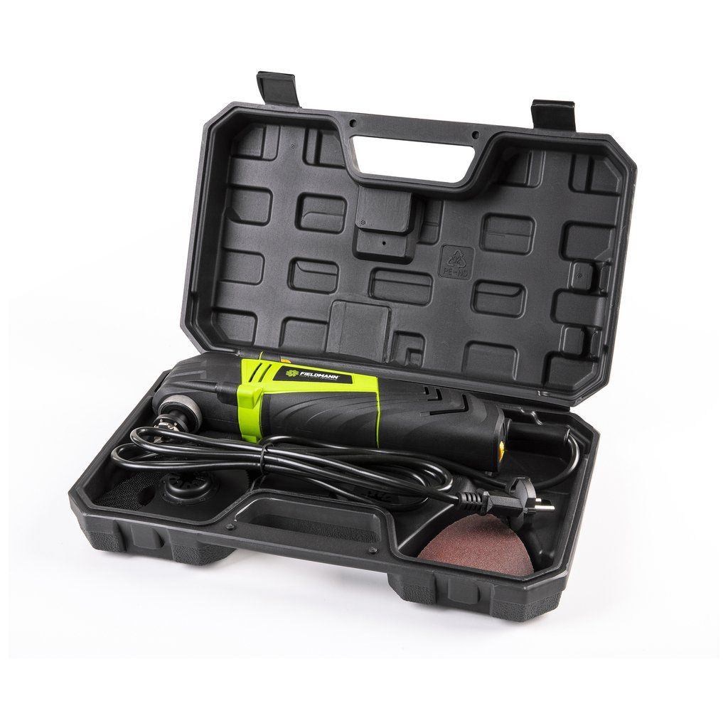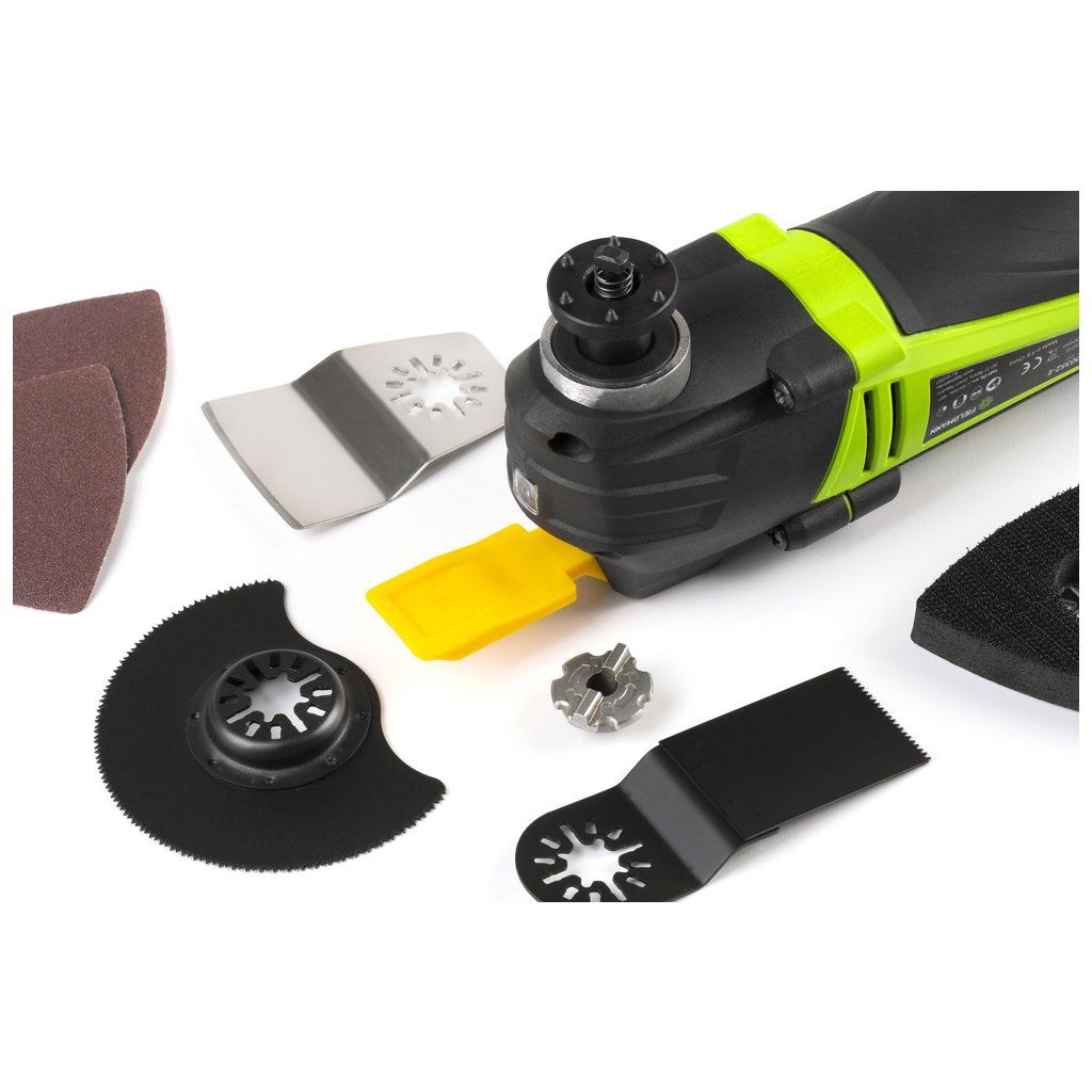 Oscilační bruska se pyšní svojí úžasnou variabilitou použití. Silný motor o příkonu 350W s možností regulace otáček si dokáží poradit s téměř jakýmkoliv materiálem při broušení, řezání či seškrabávání různých materiálů. Pomocí velké variability nástavců lze materiál brousit nebo leštit, nástavcem trojúhelníkového tvaru docílíte dosah i do méně přístupných míst, řezat kovové předměty jako trubky, hřebíky, šrouby nebo vyřezávat přesné potřebné tvary do pracovních desek, skříněk či sádrokartonu. Nástavec nože špachtlovaného tvaru výrazně usnadní odříznutí starého koberce nebo linolea z podlahy bez potřeby vynaložení příliš vlastní energie. Také lze velmi snadno vyříznout rozbitou dlaždici nebo obkladačku a opravit tak toto poškozené místo. Kromě 15 ks nástavců naleznete též v balení praktický plastový kufřík, nesmíme opomenout, že součástí stroje je i praktické LED světlo.