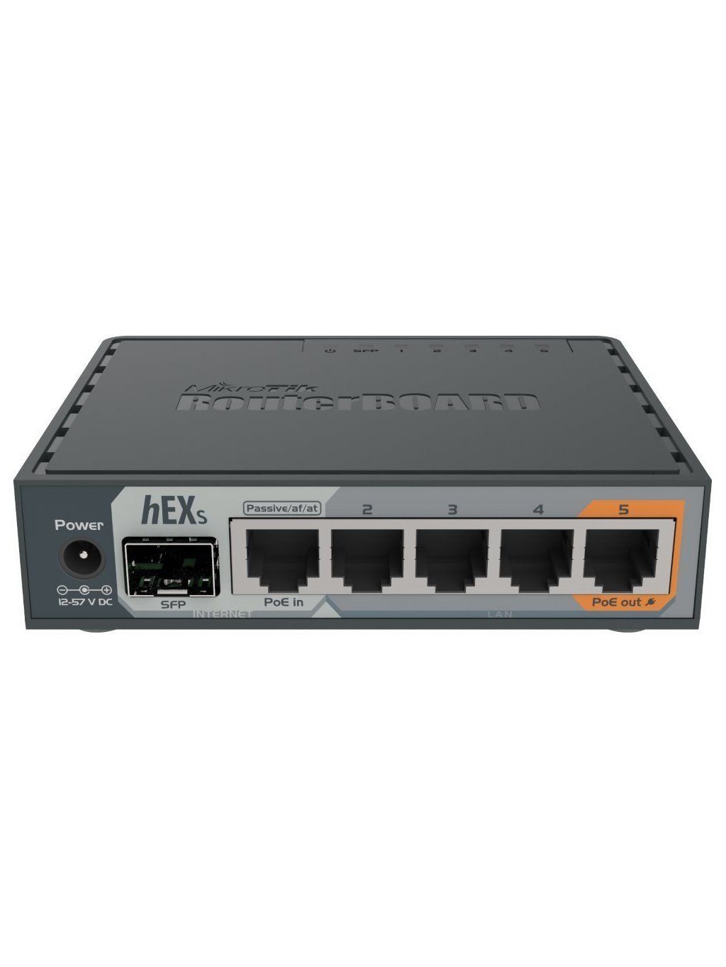 MikroTik RB760iGS hEX SRouterBoard hEX S (RB760iGS) s procesorem MediaTek MT7621A (Dual-Core 880 MHz), 256 MB RAM paměť + 16 MB storage (Flash). Disponuje 1,25 Gb/s SFP portem, díky kterému je možné připojit optický miniGBIC modul. RouterBoard podporuje PoE vstup i 1× PoE výstup.