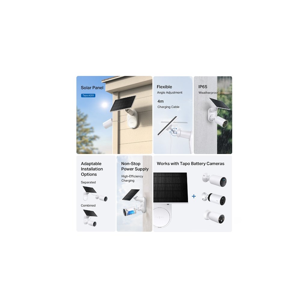 - Funguje s bateriovými kamerami Tapo: Kompatibilní se všemi bateriovými kamerami Tapo, což umožňuje celoroční ochranu vaší bateriové kamery Tapo.