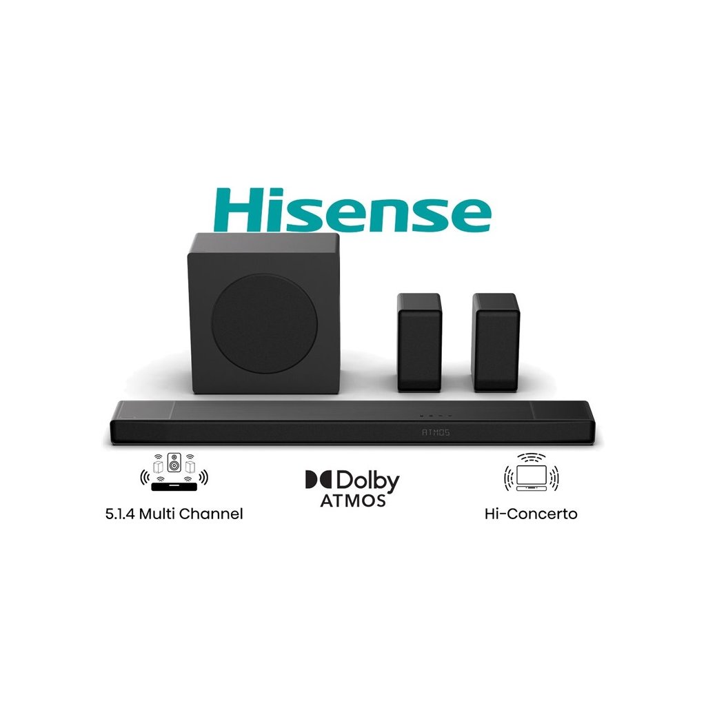 5.1.4 CH kanálový soundbar, celkový výkon 600W (aktivní subwoofer 280W), Dolby Atmos, Dolby Digital Plus, Dolby Digital, DTS Virtual :X, Ekvalizér (Movie/Music/Game/News/Sport/Pro/AI), Hi-Concerto, EZ Play, HDMI, USB, Optický, AUX, Bluetooth, LED displej, Instalační sada na zeďDoplňkové parametry