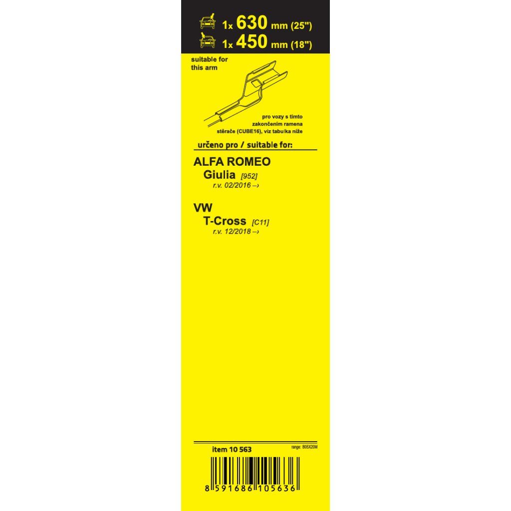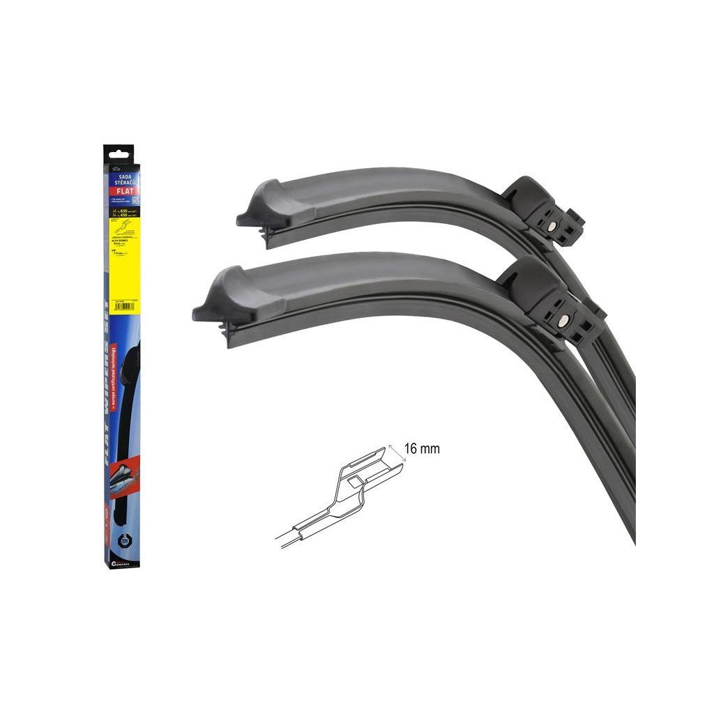 Sada dvou plochých stěračů FLAT (řidič + spolujezdec) se speciálním uchycením. Délky stěračů a systém uchycení na ramínko jsou přizpůsobeny vybraným vozům (viz tabulka použití).
