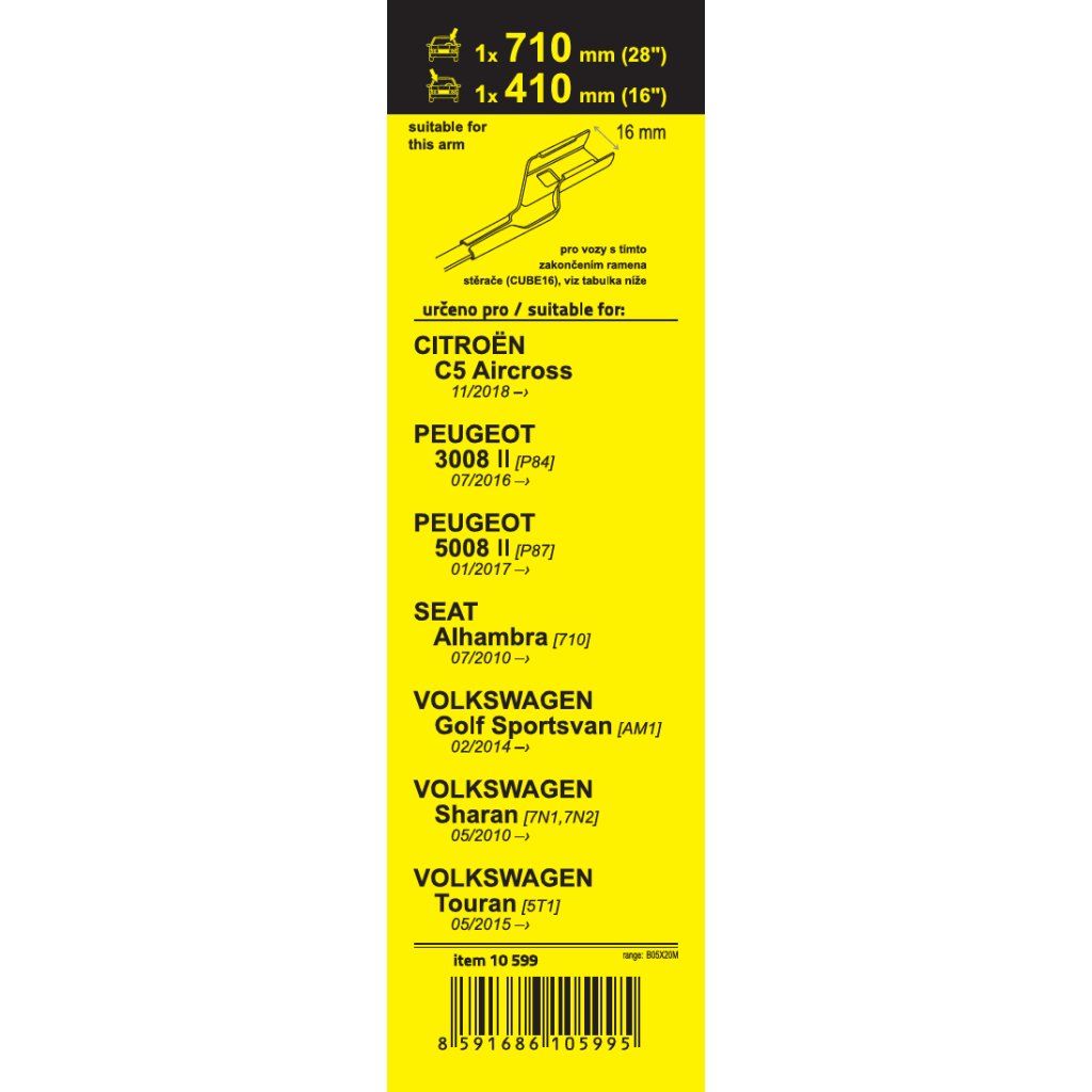 Sada dvou plochých stěračů FLAT (řidič + spolujezdec) se speciálním uchycením. Délky stěračů a systém uchycení na ramínko jsou přizpůsobeny vybraným vozům (viz tabulka použití).