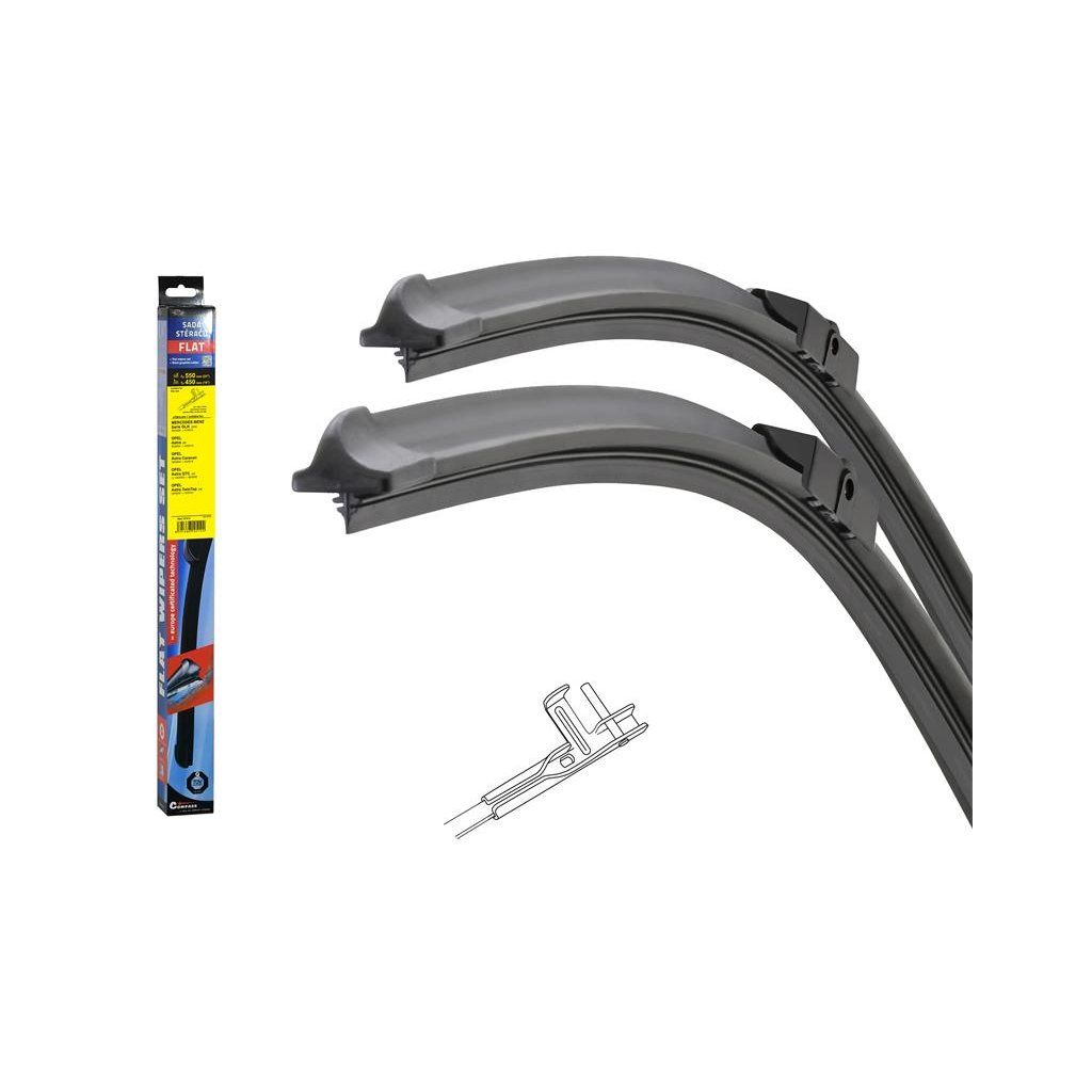 Sada dvou plochých stěračů FLAT (řidič + spolujezdec) se speciálním uchycením. Délky stěračů a systém uchycení na ramínko jsou přizpůsobeny vybraným vozům (viz tabulka použití).