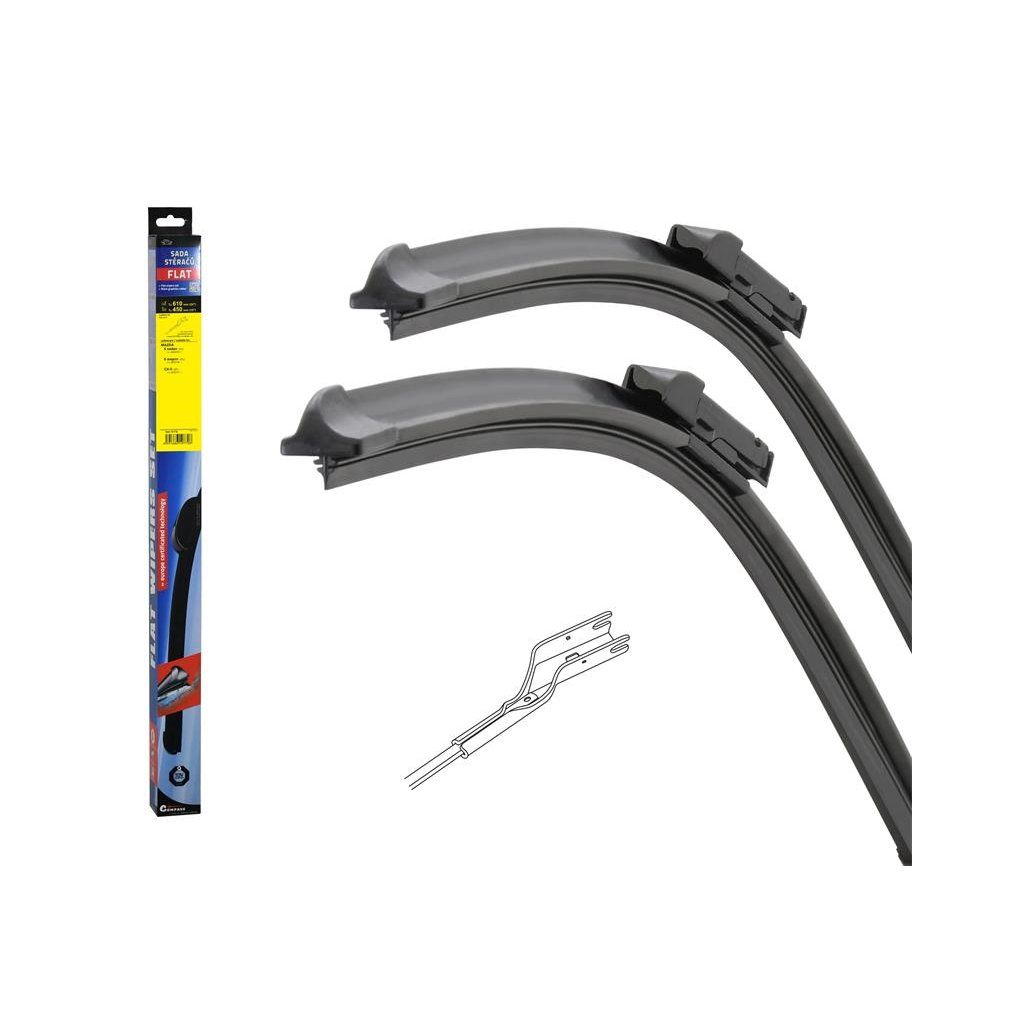 Sada dvou plochých stěračů FLAT (řidič + spolujezdec) se speciálním uchycením. Délky stěračů a systém uchycení na ramínko jsou přizpůsobeny vybraným vozům (viz tabulka použití).
