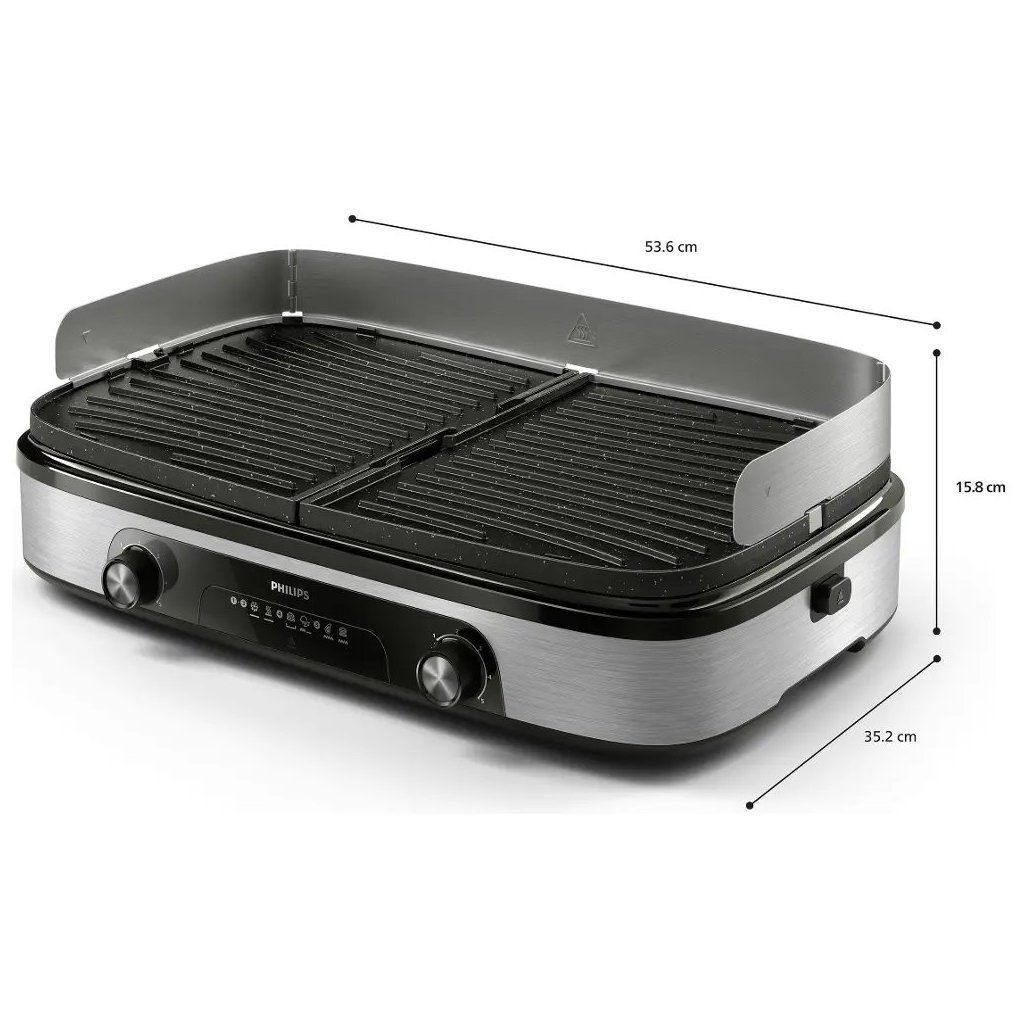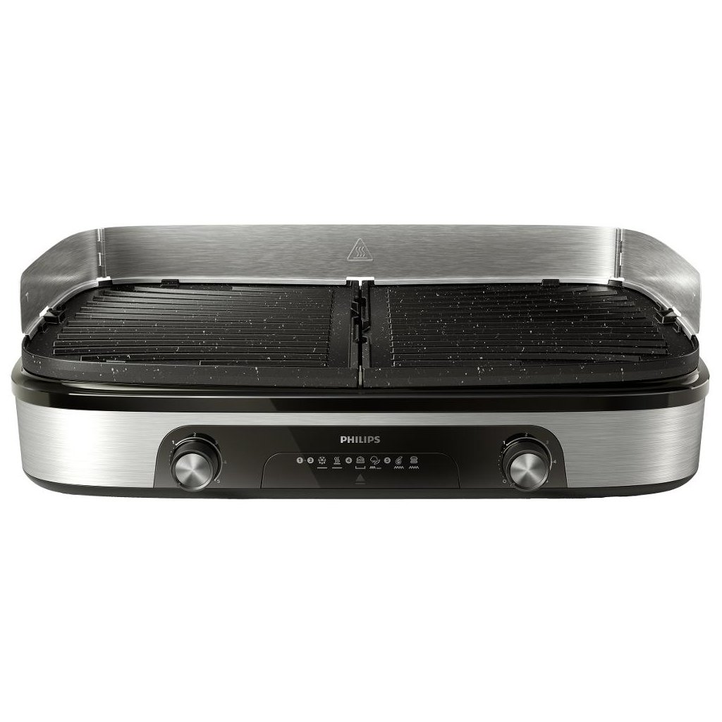 Gril disponuje oboustrannými deskami a dvěma grilovacími oblastmi, což umožňuje připravovat různé druhy pokrmů současně. Povrchová úprava z kamene Maifan chrání desky před poškrábáním a zajišťuje dlouhou životnost. Vyjímatelné grilovací plotýnky usnadňují údržbu a čištění po použití.