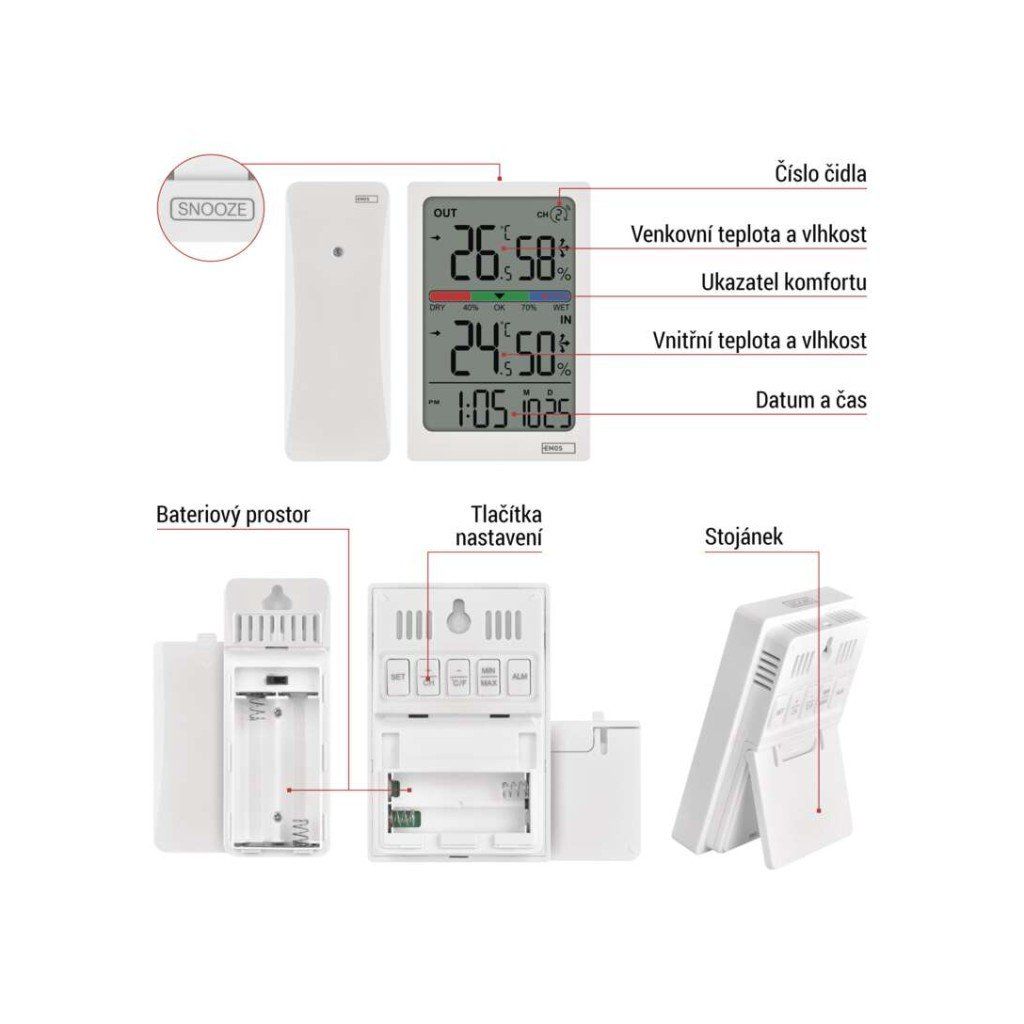 Zařízení je vybaveno tříúrovňovým ukazatelem komfortu, který vyhodnocuje vnitřní vlhkost prostředí (suché/komfortní/vlhké), a funkcí zobrazení trendu teploty. K základní stanici můžete připojit až 3 bezdrátová čidla (samostatně prodávaná pod číslem E00387), což vám umožní monitorovat teplotu v různých místnostech nebo venkovních prostorách.
