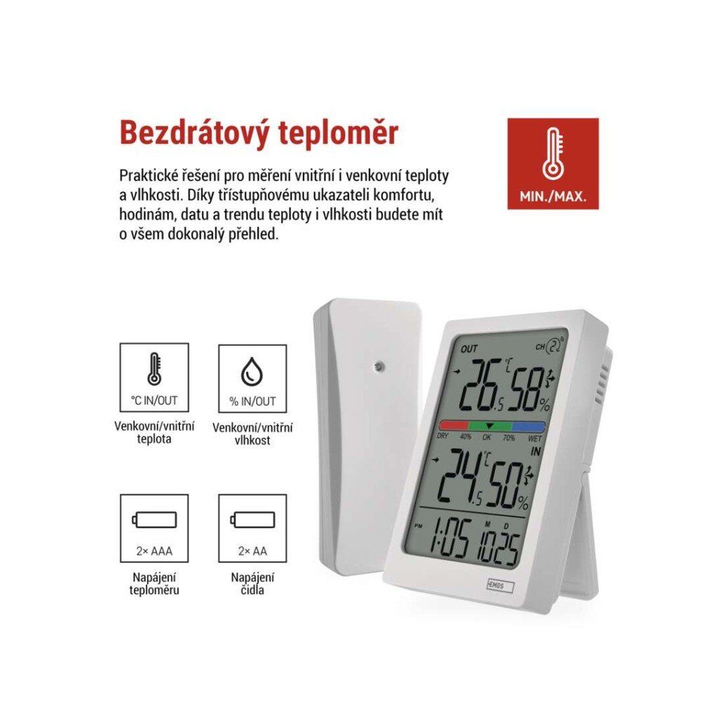 Digitální teploměr EMOS E0558W je moderní bezdrátový teploměr s vlhkoměrem, který vám poskytne komplexní informace o klimatických podmínkách uvnitř i venku. Díky bezdrátovému čidlu s dosahem až 100 metrů získáte přehled o venkovní teplotě a vlhkosti bez nutnosti propojení kabely. Teploměr zobrazuje teplotu s vysokou přesností 0,1 °C, vlhkost v rozsahu 1 % až 99 % RV a nabízí praktické funkce jako quartz hodiny, budík, opakované buzení i zobrazení data.