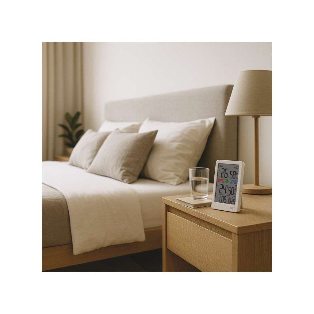 - Univerzální umístění: Teploměr můžete postavit na poličku nebo zavěsit na zeď.